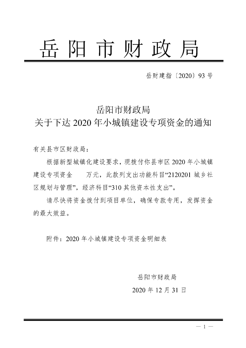 岳阳市财政局关于下达2020年小城镇建设专项资金的通知