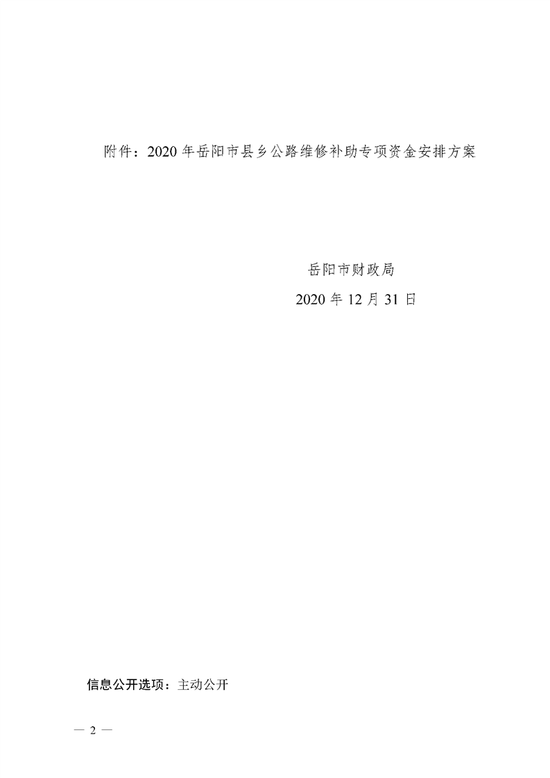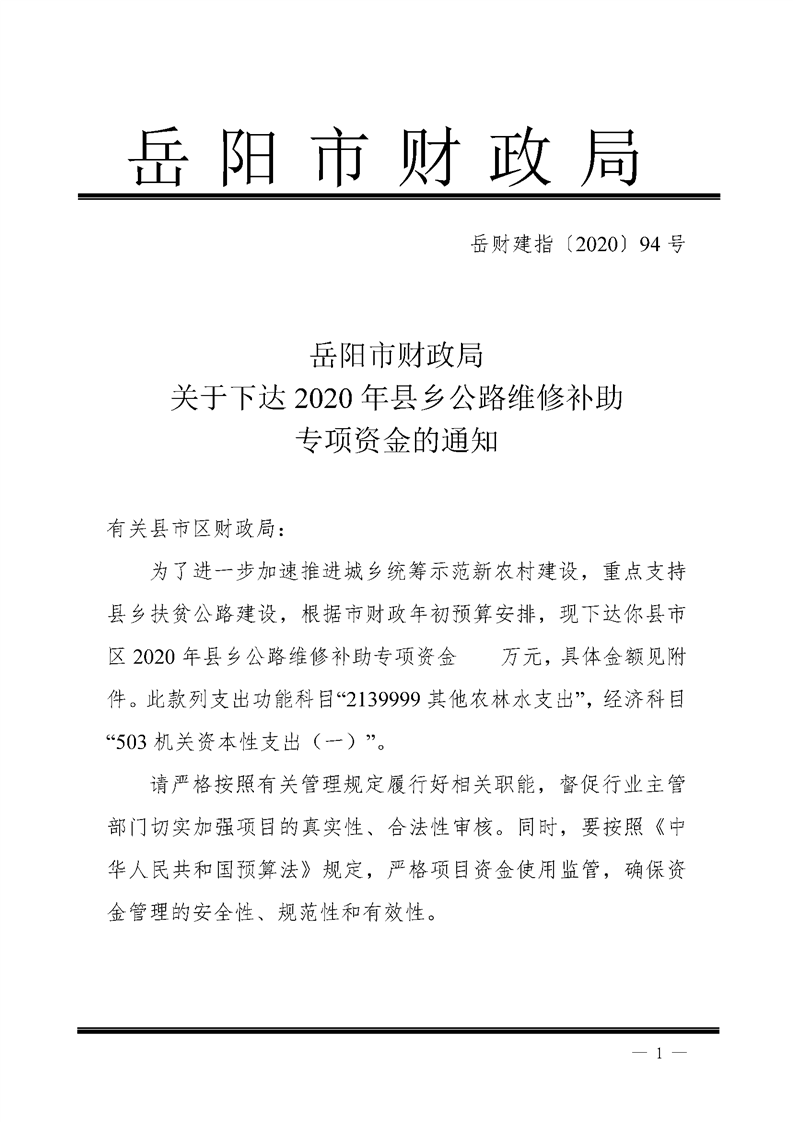 岳阳市财政局关于下达2020年县乡公路维修补助专项资金的通知