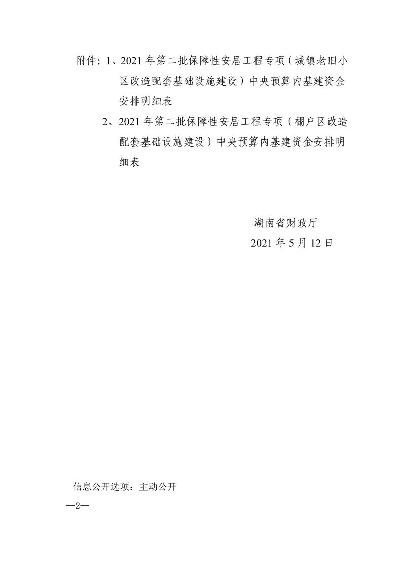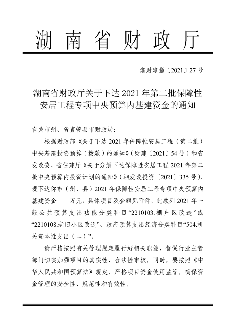 湖南省财政厅关于下达2021年第二批保障性安居工程专项中央预算内基建资金的通知