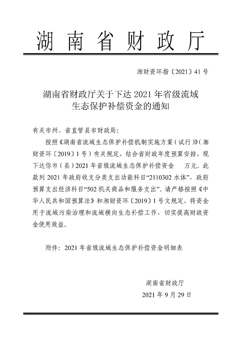湖南省财政厅关于下达2021年省级流域生态保护补偿资金的通知