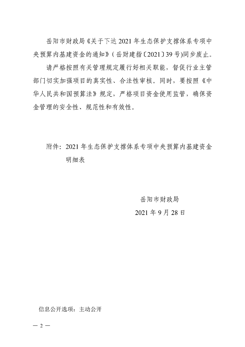 岳阳市财政局关于下达2021年生态保护支撑体系专项中央预算内基建资金的通知