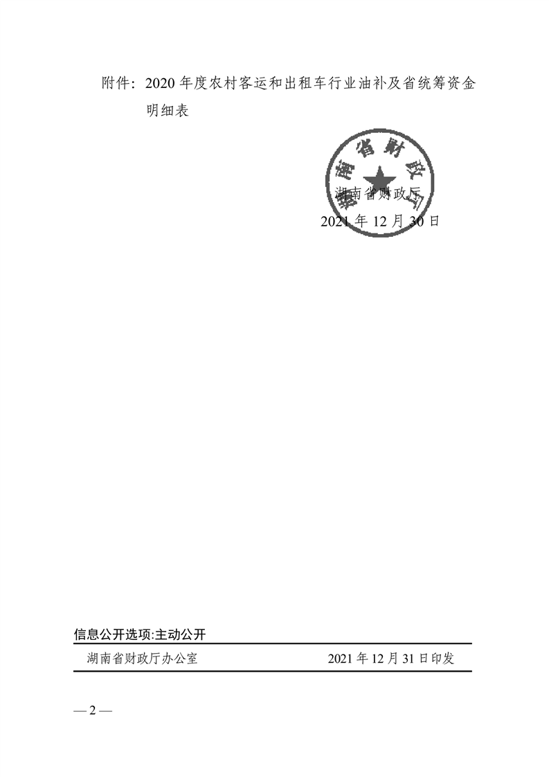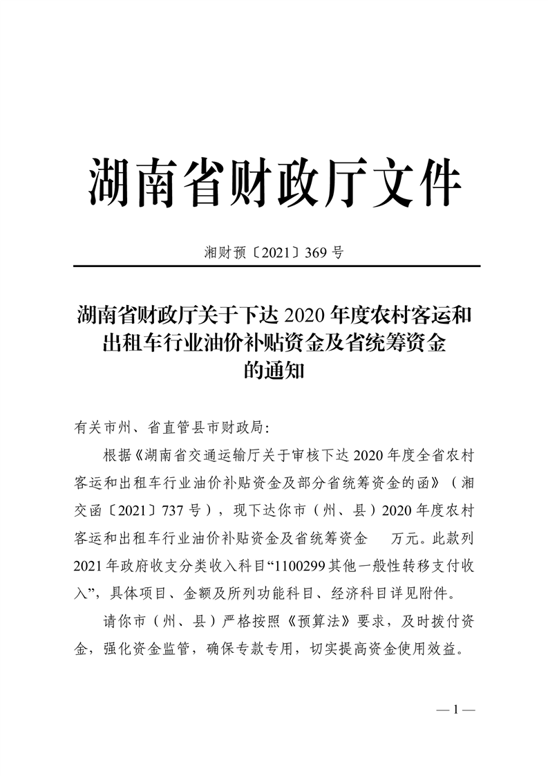 关于下达2020年度农村客运和出租车行业油价补贴资金及省统筹资金的通知