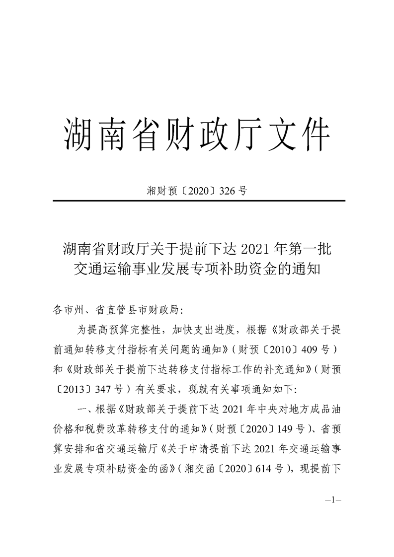 关于提前下达2021年第一批交通运输事业发展专项补助资金的通知