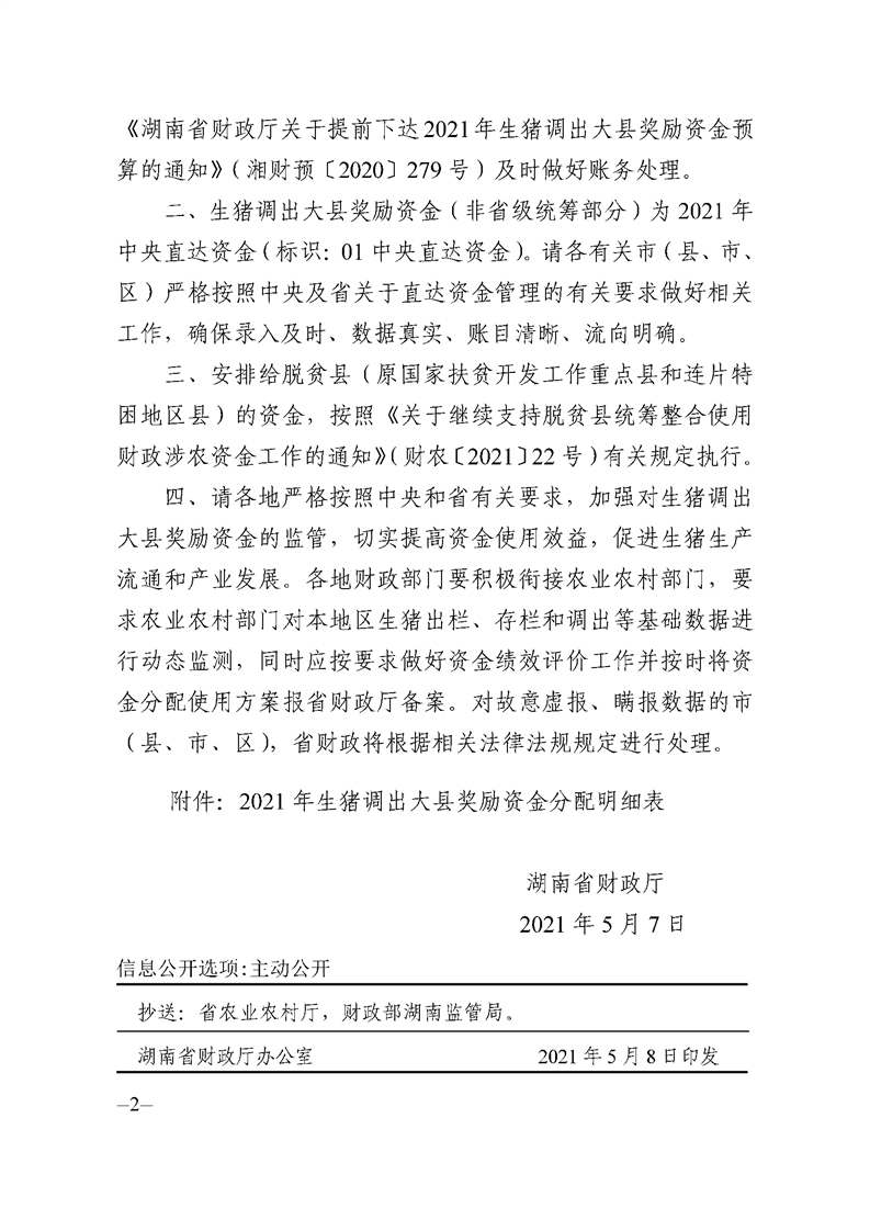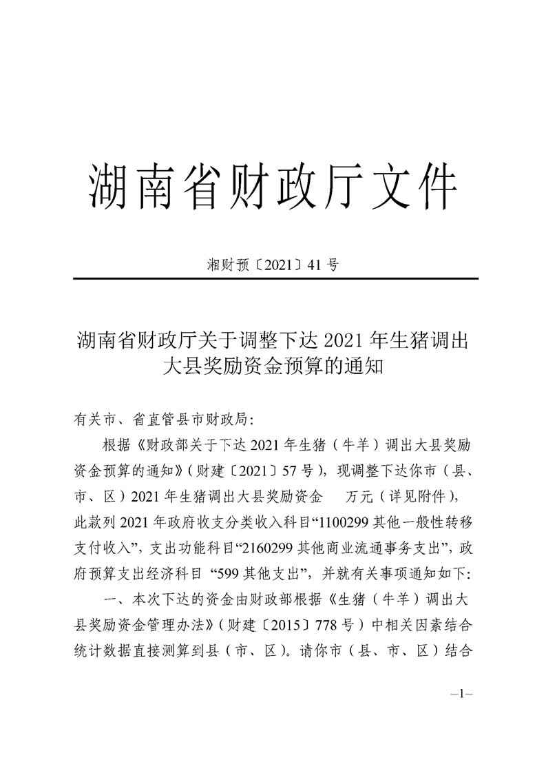 关于调整下达2021年生猪调出大县奖励资金预算的通知