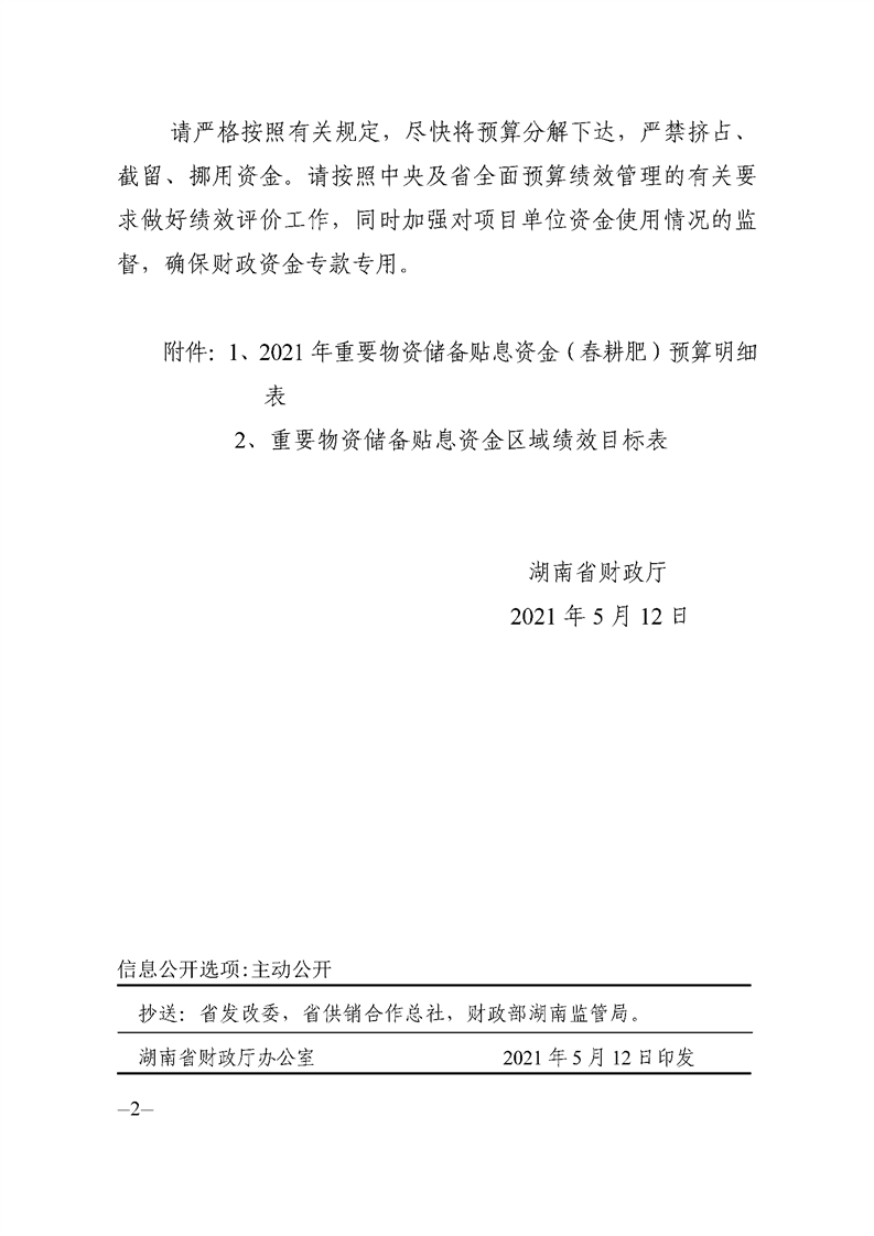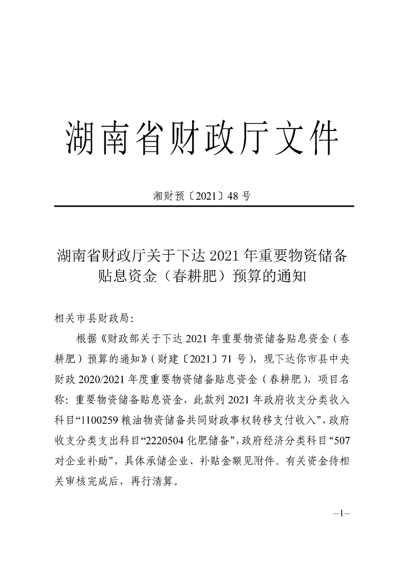 关于下达2021年重要物资储备贴息资金(春耕肥)预算的通知