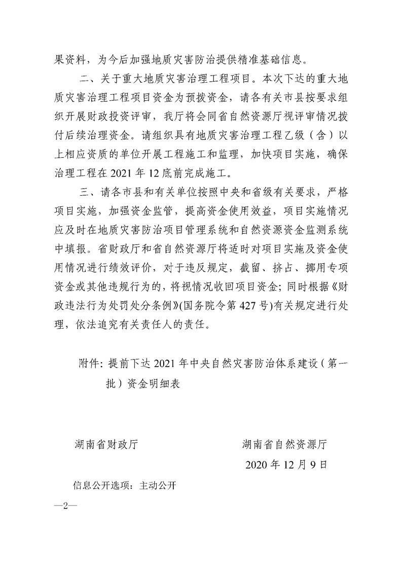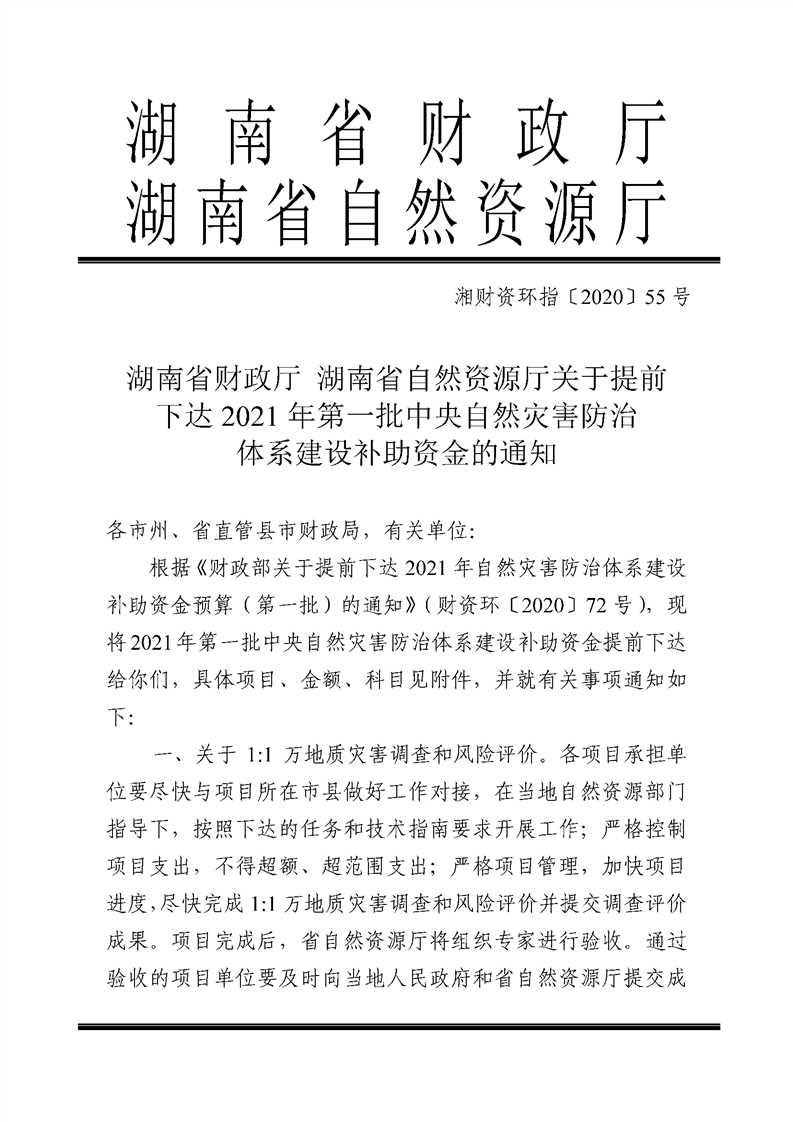 湖南省财政厅 湖南省自然资源厅关于提前下达2021年第一批中央自然灾害防治体系建设补助资金的通知