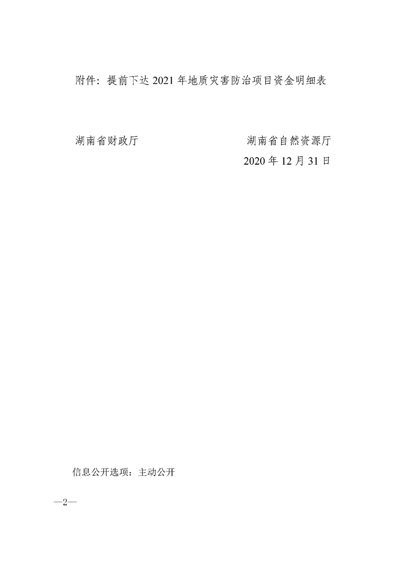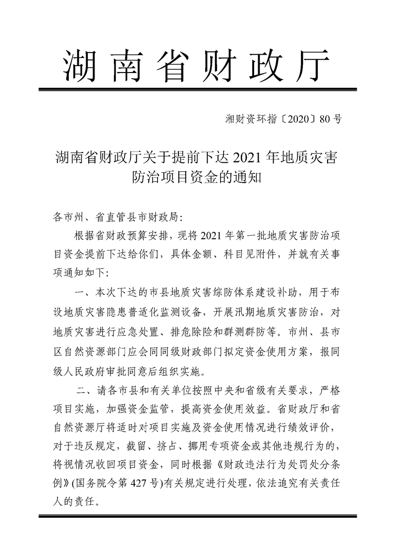 湖南省财政厅关于提前下达2021年地质灾害防治项目资金的通知