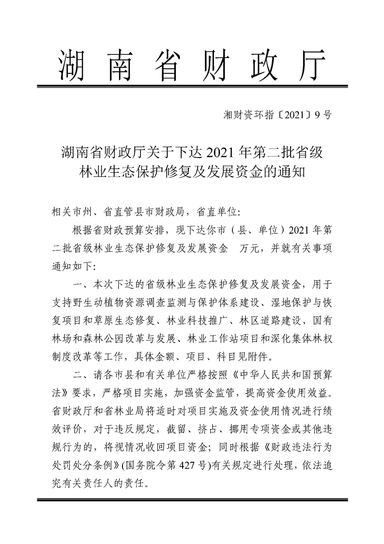 湖南省财政厅关于下达2021年第二批省级林业生态保护修复及发展资金的通知