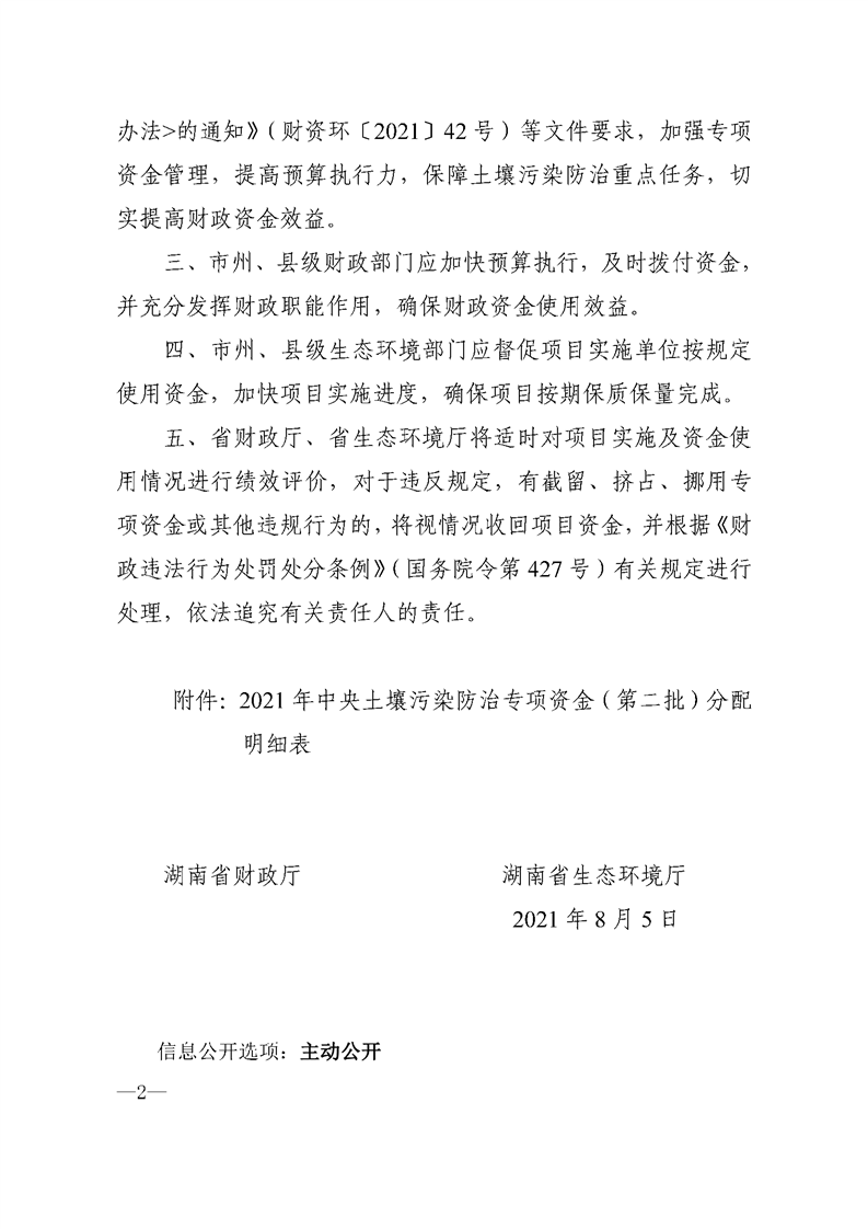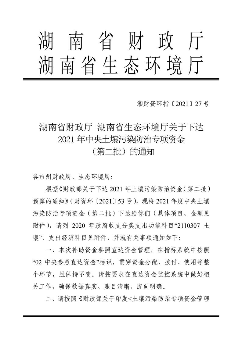 湖南省财政厅_湖南省生态环境厅关于下达2021年中央土壤污染防治专项资金(第二批)的通知