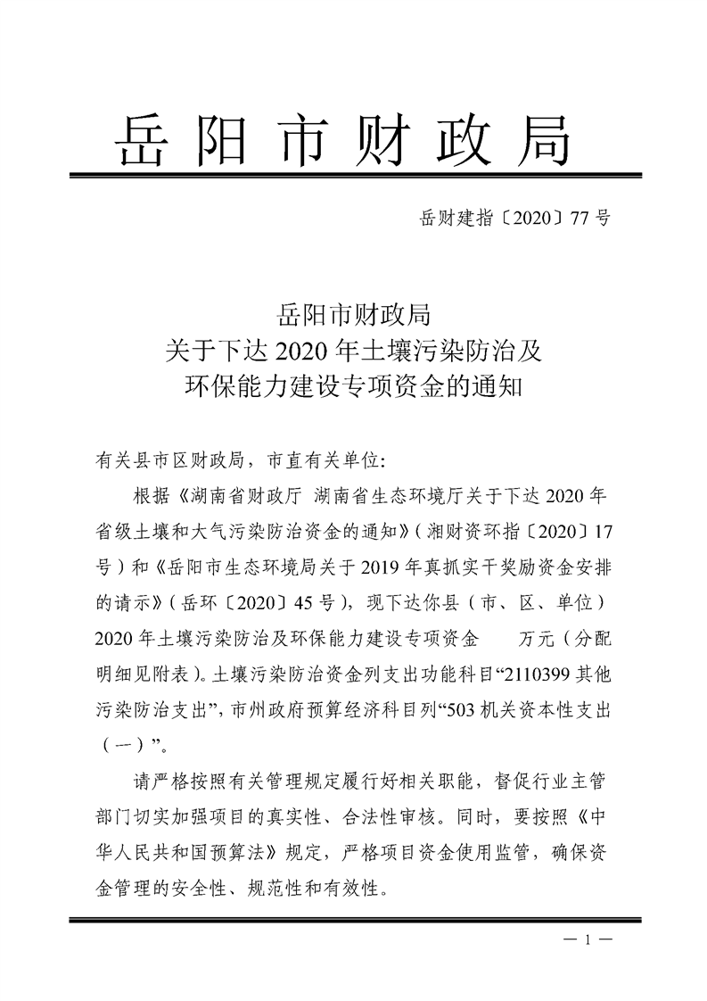 岳财建指〔2020〕77号 岳阳市财政局关于下达2020年土壤污染防治及环保能力建设专项资金的通知
