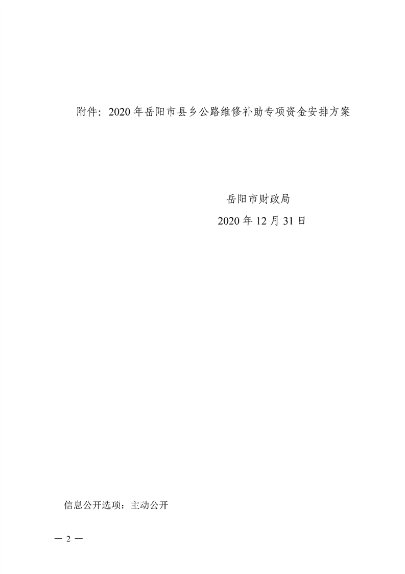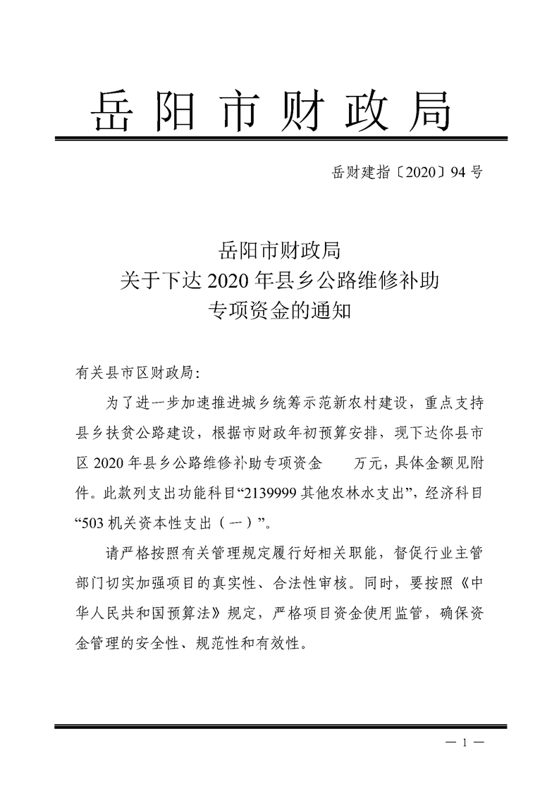 岳阳市财政局关于下达2020年县乡公路维修补助专项资金的通知