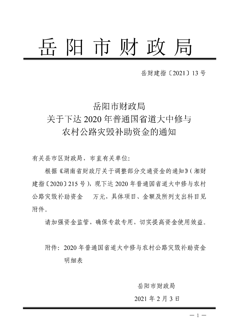 岳阳市财政局关于下达2020年普通国省道大中修与农村公路灾毁补助资金的通知
