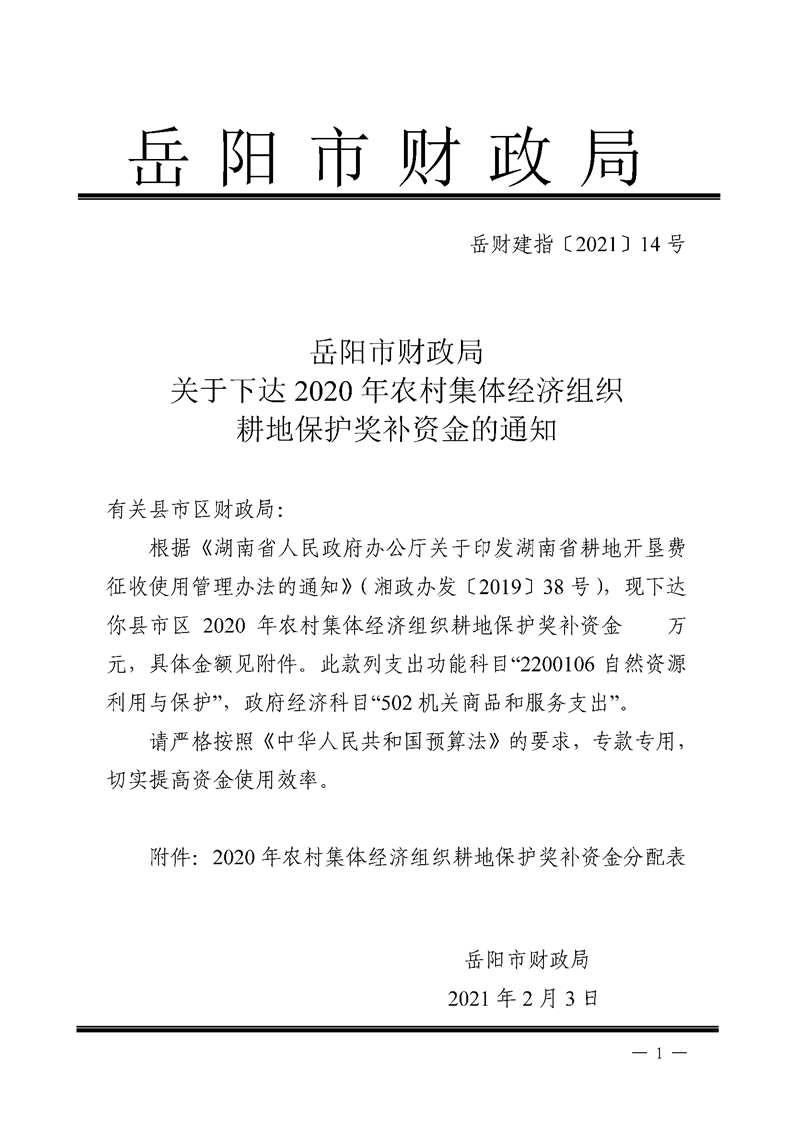 岳阳市财政局关于下达2020年农村集体经济组织耕地保护奖补资金的通知