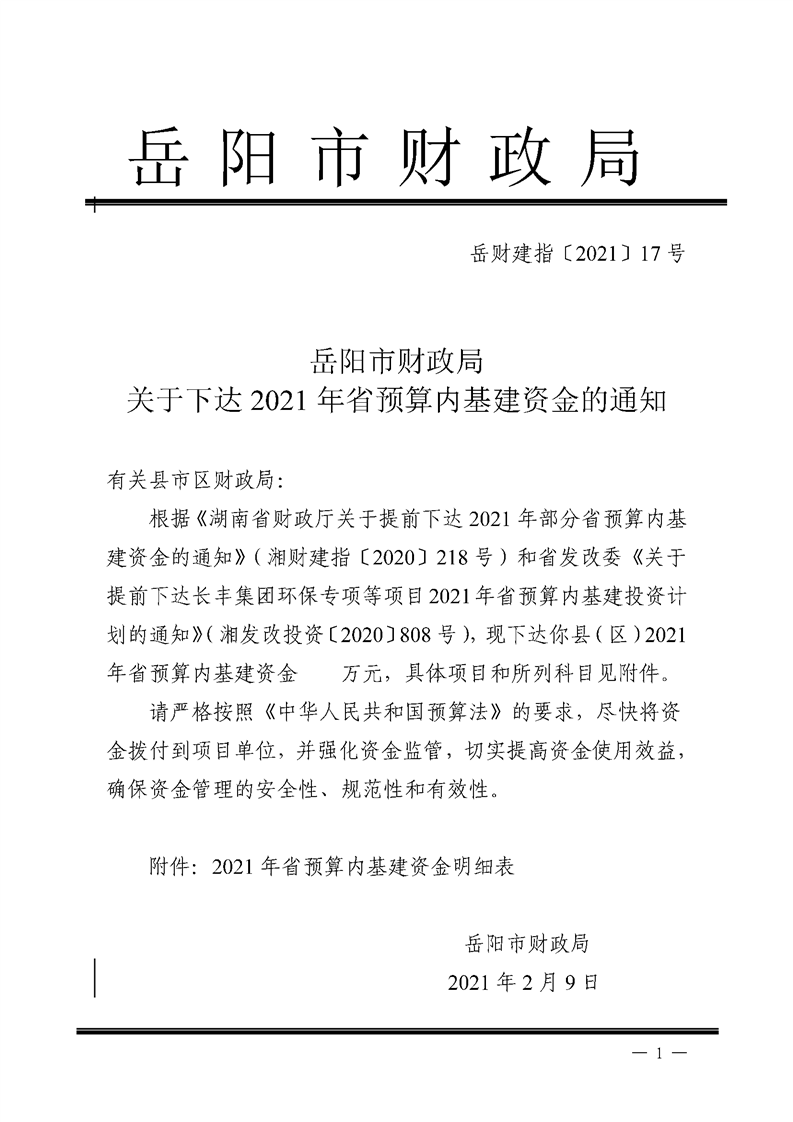 岳阳市财政局关于下达2021年省预算内基建资金的通知