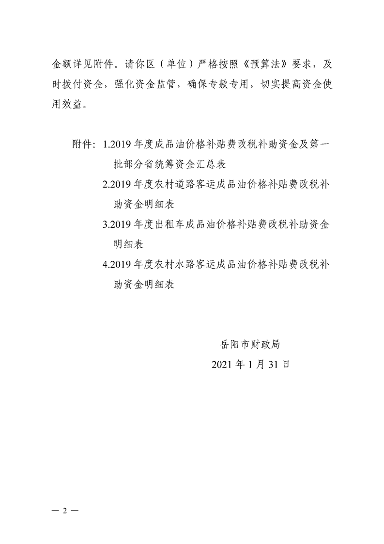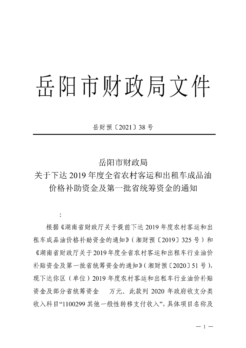 岳阳市财政局关于下达2019年度全省农村客运和出租车成品油价格补助资金及第一批省统筹资金的通知