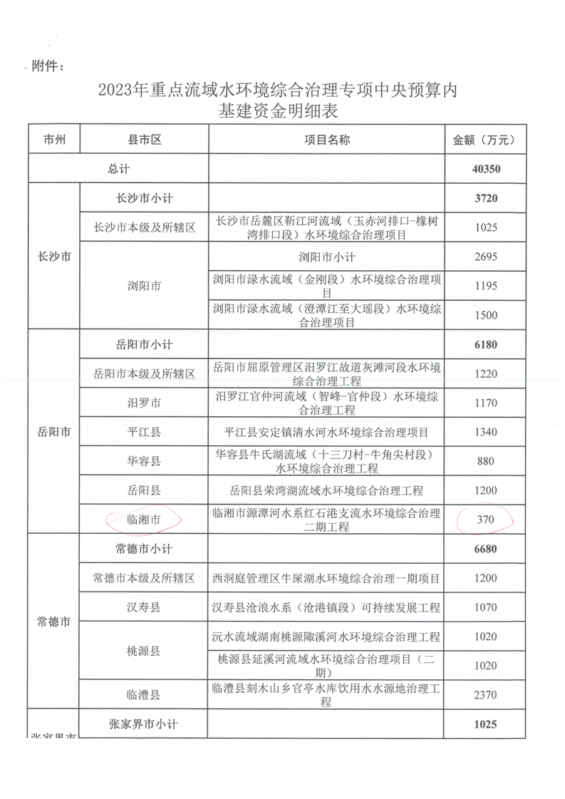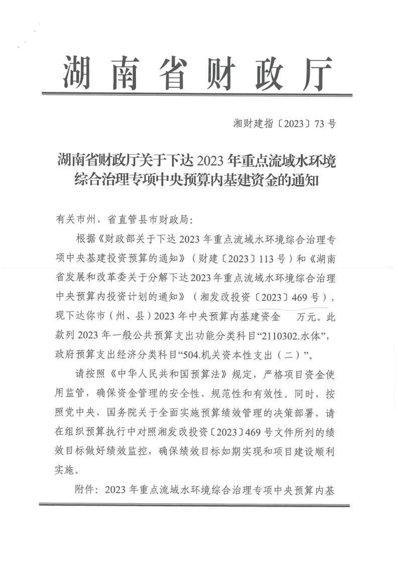 湖南省财政厅关于下达2023年重点流域水环境综合治理专项中央预算内基建资金的通知(湘财建指〔2023〕73号)
