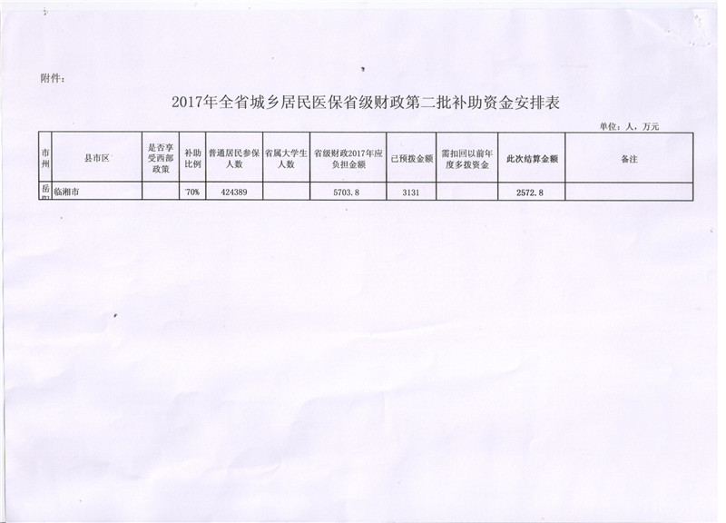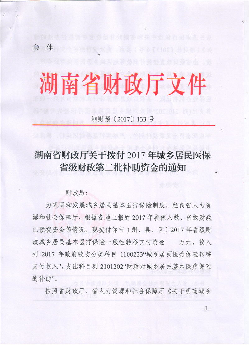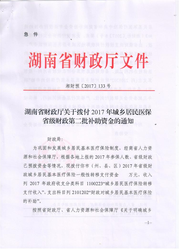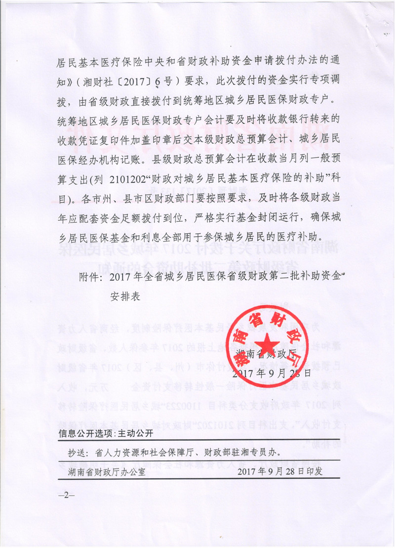 湖南省财政厅关于拨付2017年城乡居民医保省级财政第二批补助资金的通知