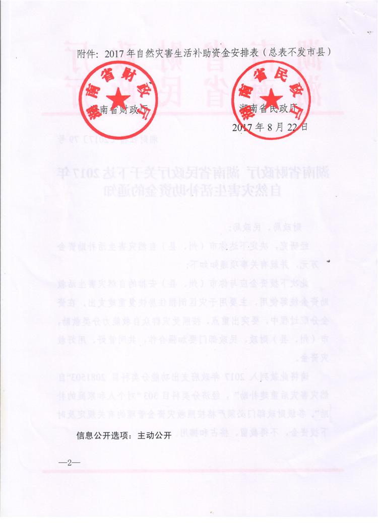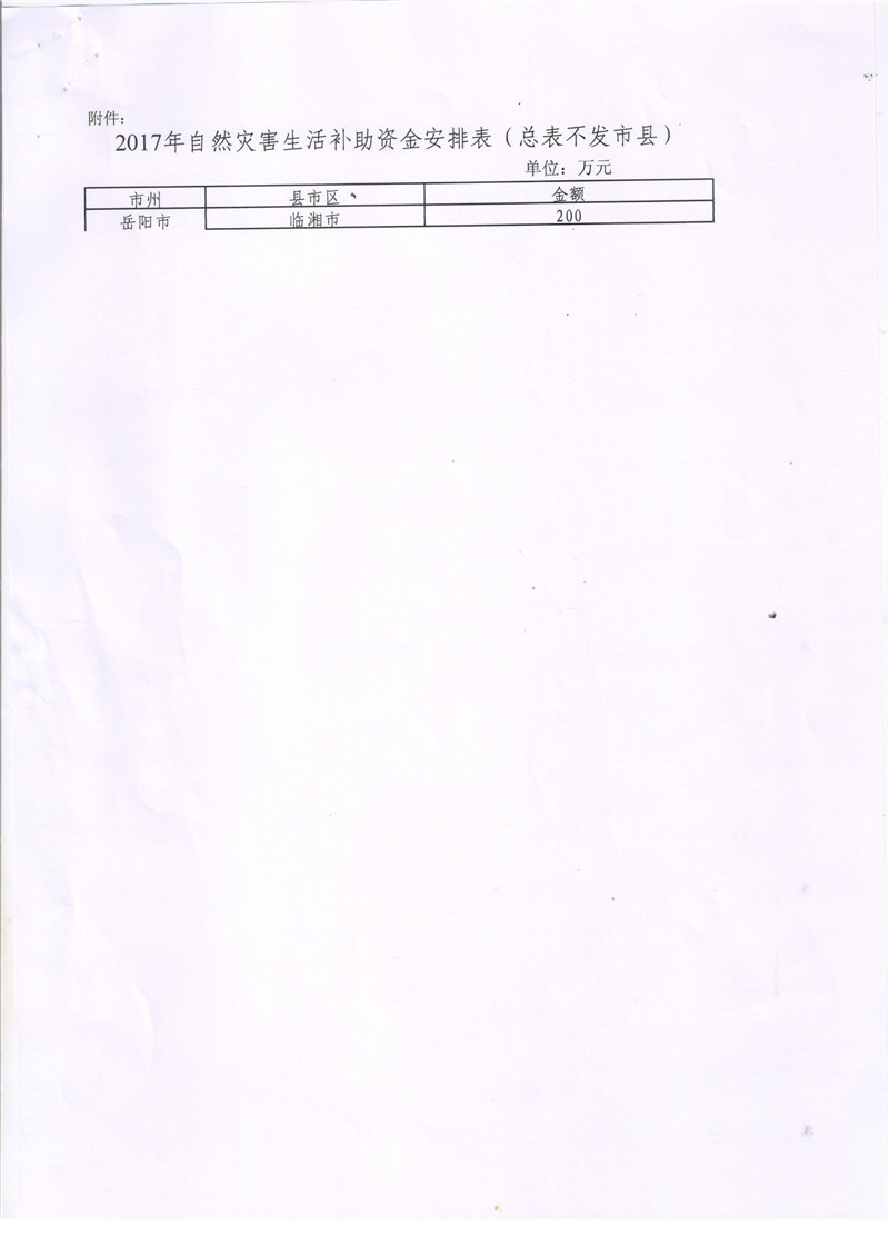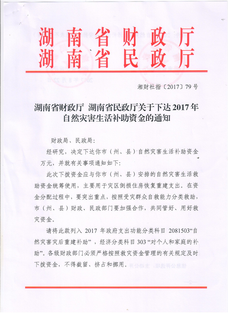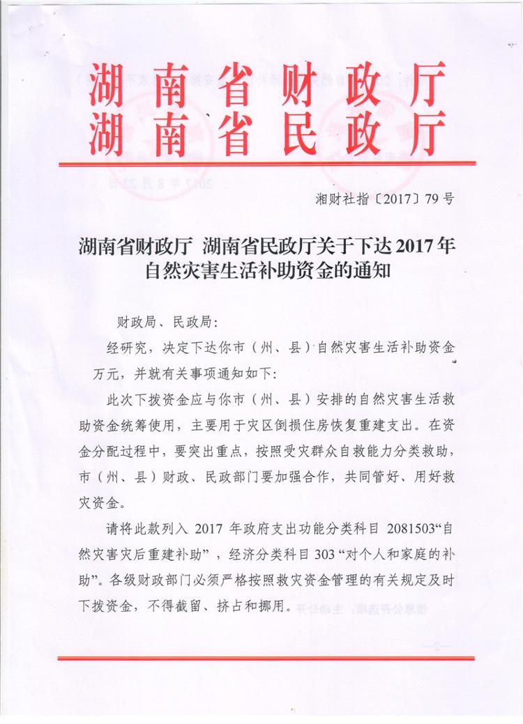 湖南省财政厅湖南省民政厅关于下达2017年自然灾害生活补助资金的通知