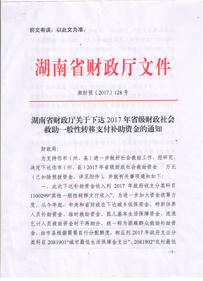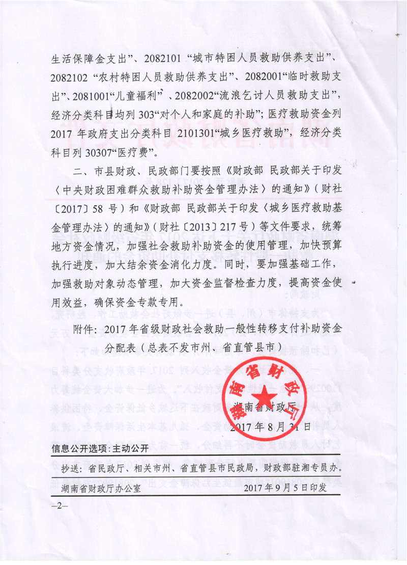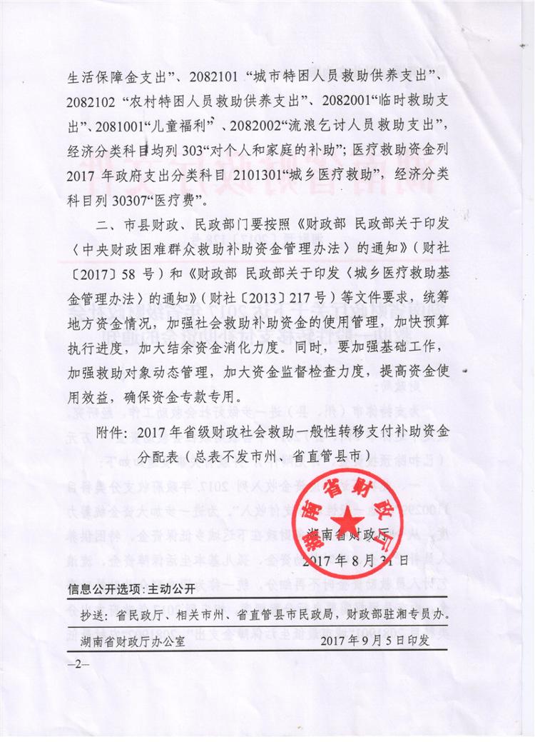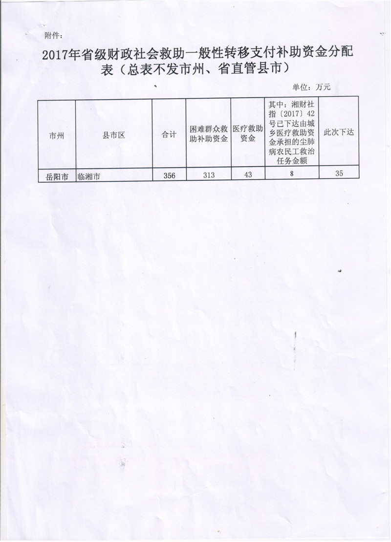 湖南省财政厅关于下达2017年省级财政社会救助一般性转移支付补助资金的通知