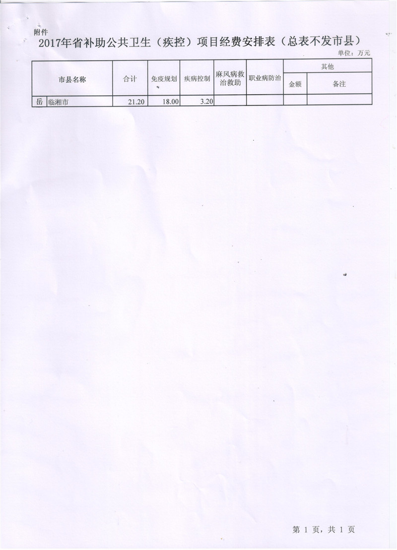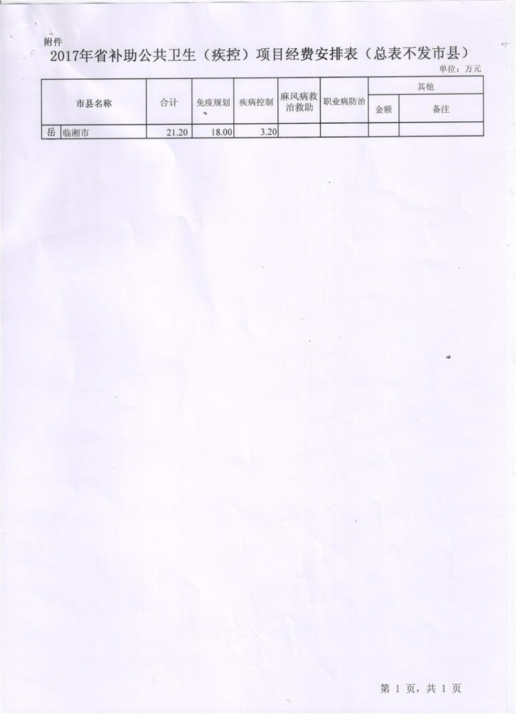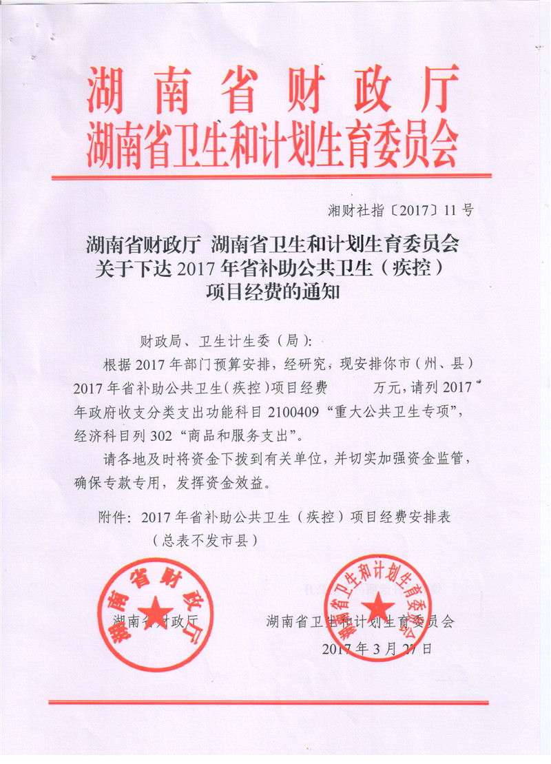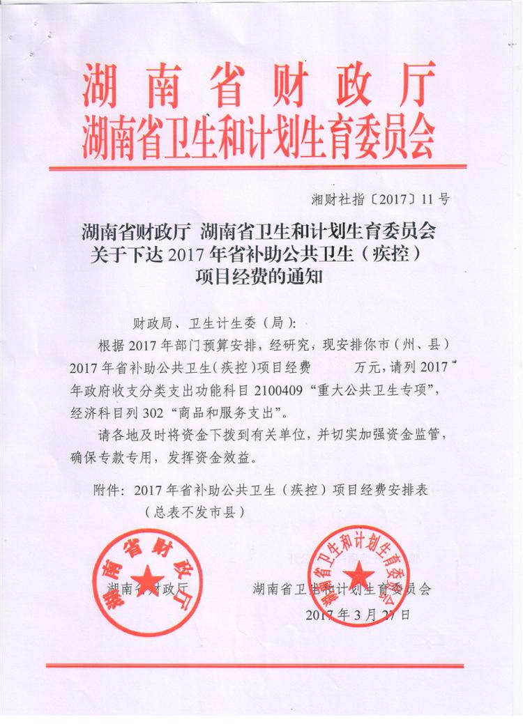 湖南省财政厅湖南省卫生和计划生育委员会关于下达2017年省级补助公共卫生项目经费的通知