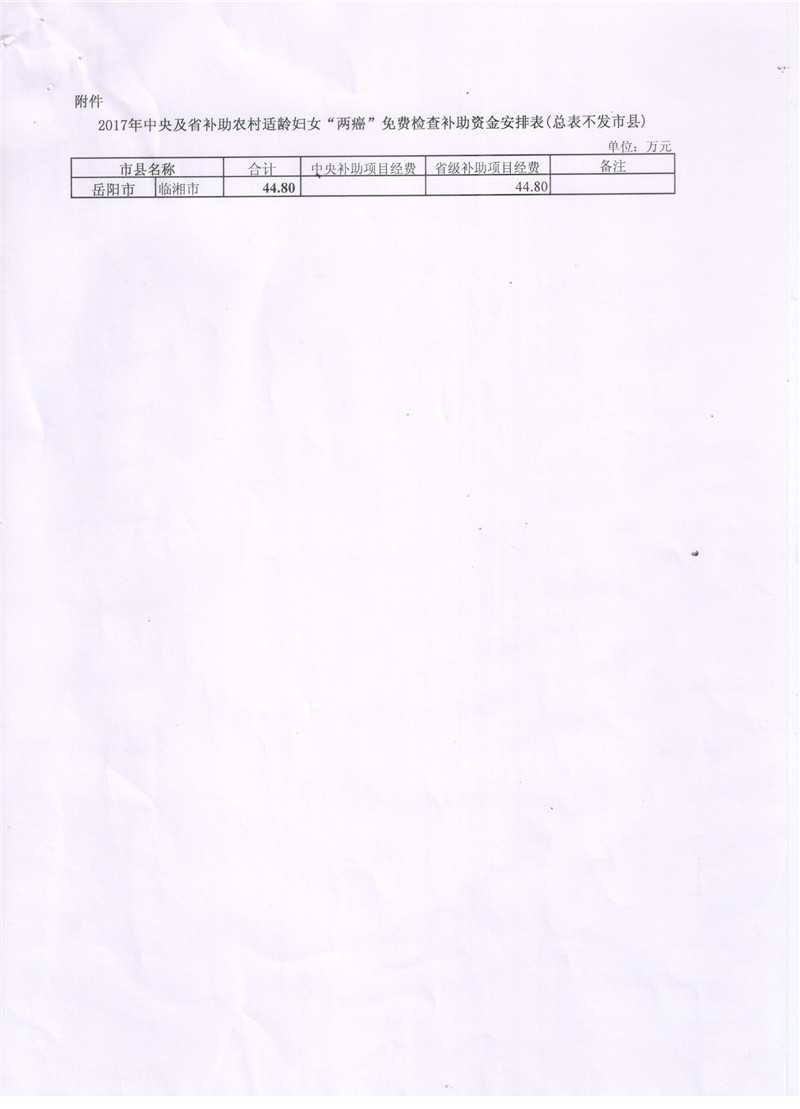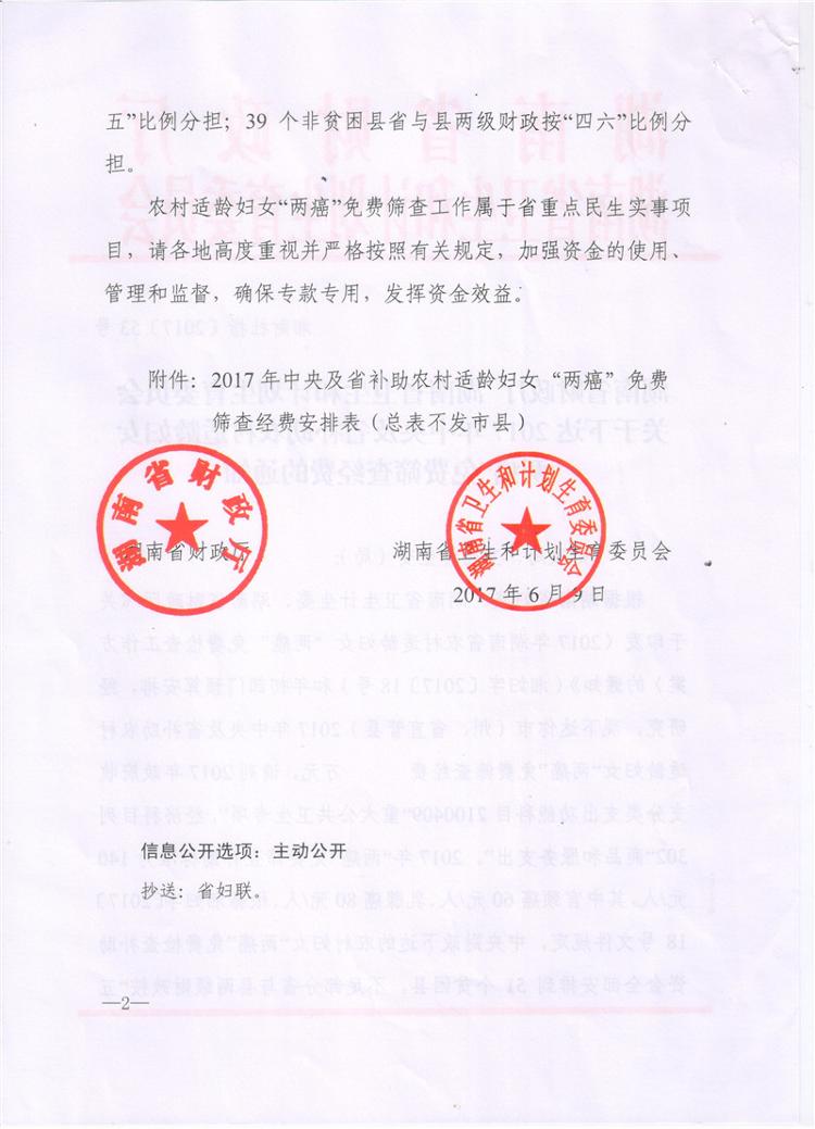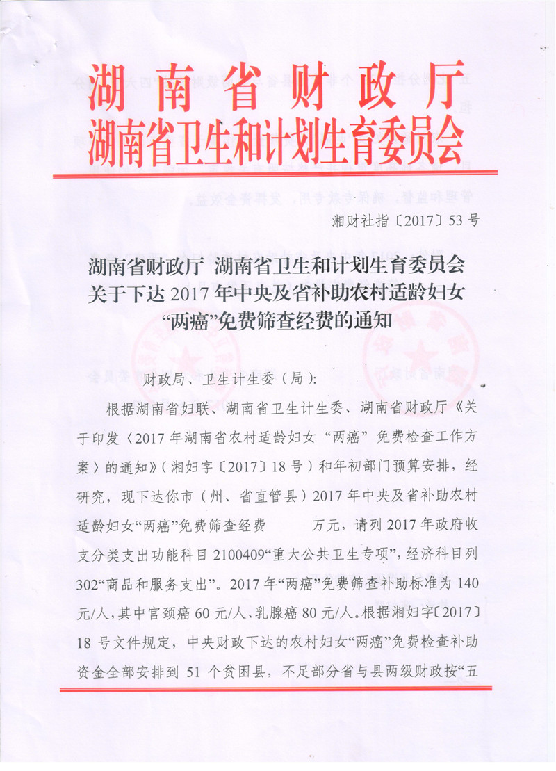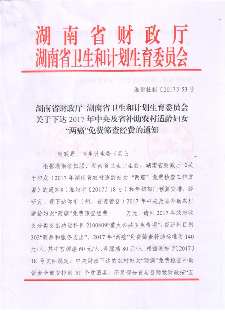 湖南省财政厅湖南省卫生和计划生育委员会关于下达2017年中央及省补助农村适龄妇女两癌免费筛查经费的通知
