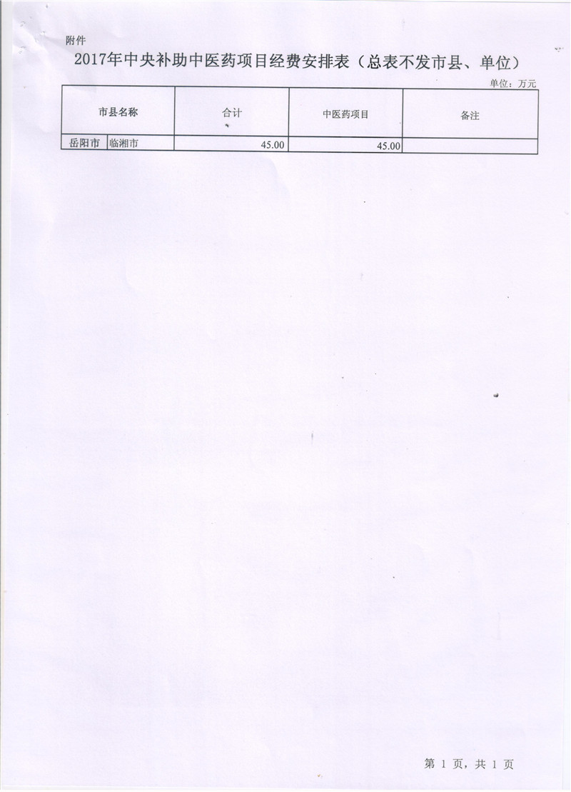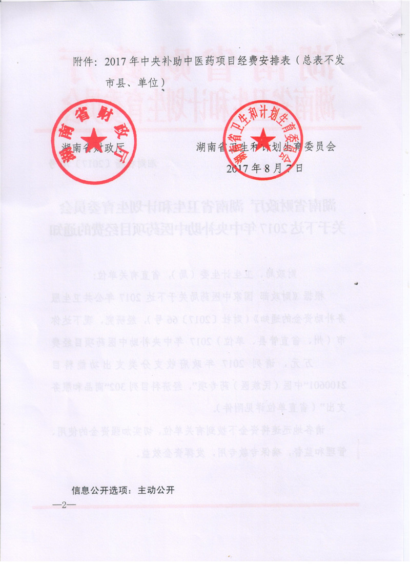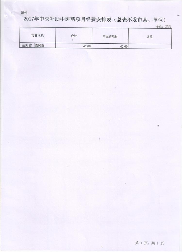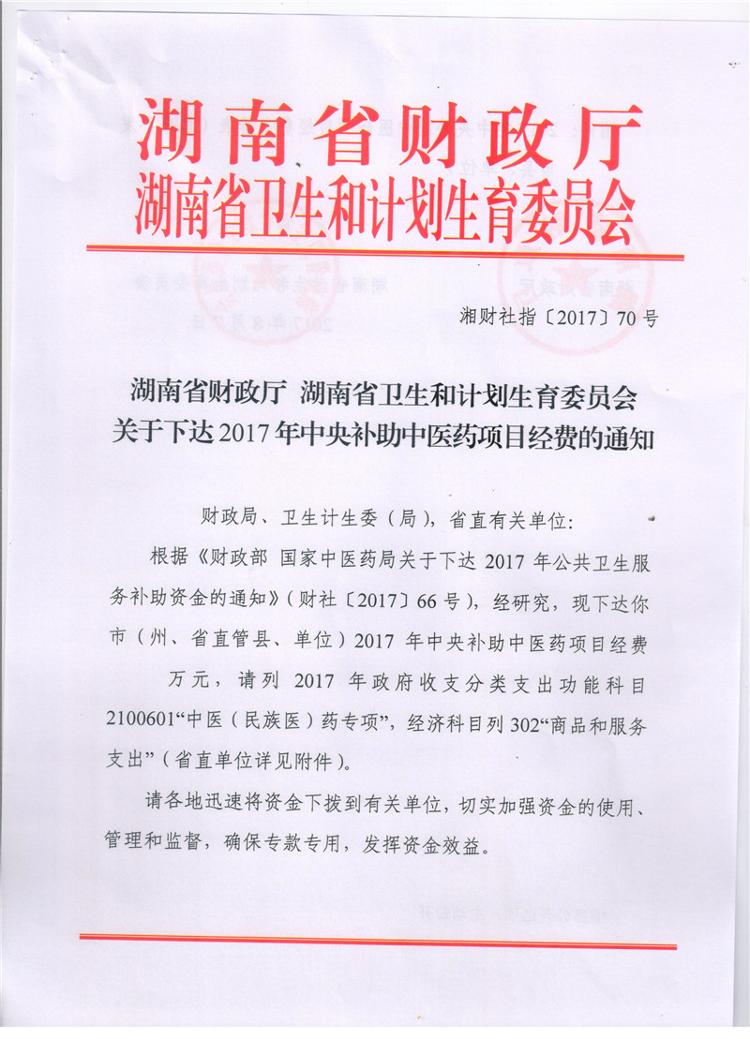 湖南省财政厅湖南省卫生和计划生育委员会关于下达2017年中央补助中医药项目经费的通知