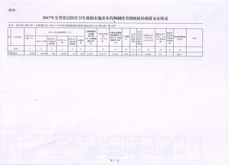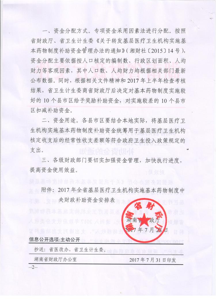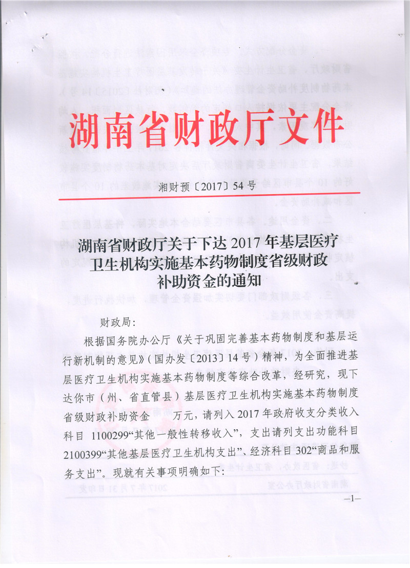 湖南省财政厅关于下达2017年基层医疗卫生机构实施基本药物制度省级财政补助资金的通知