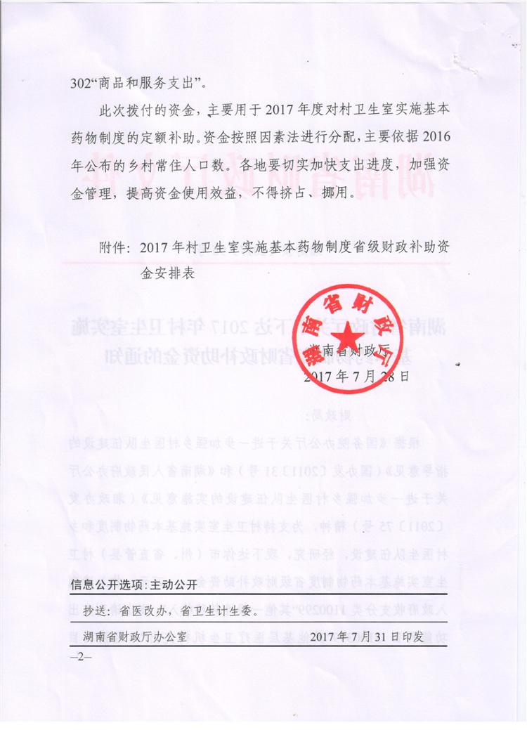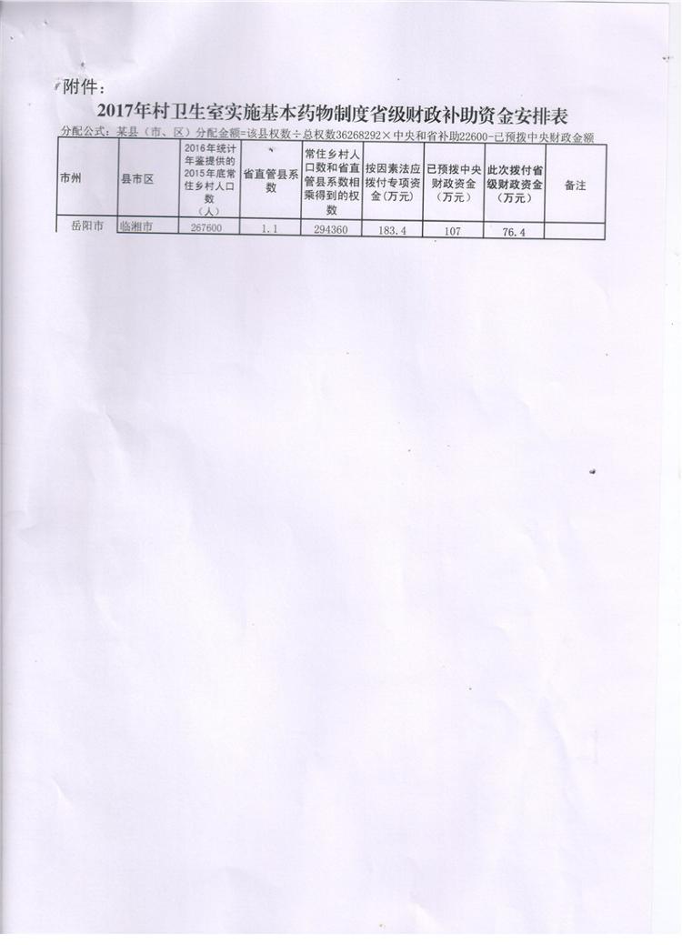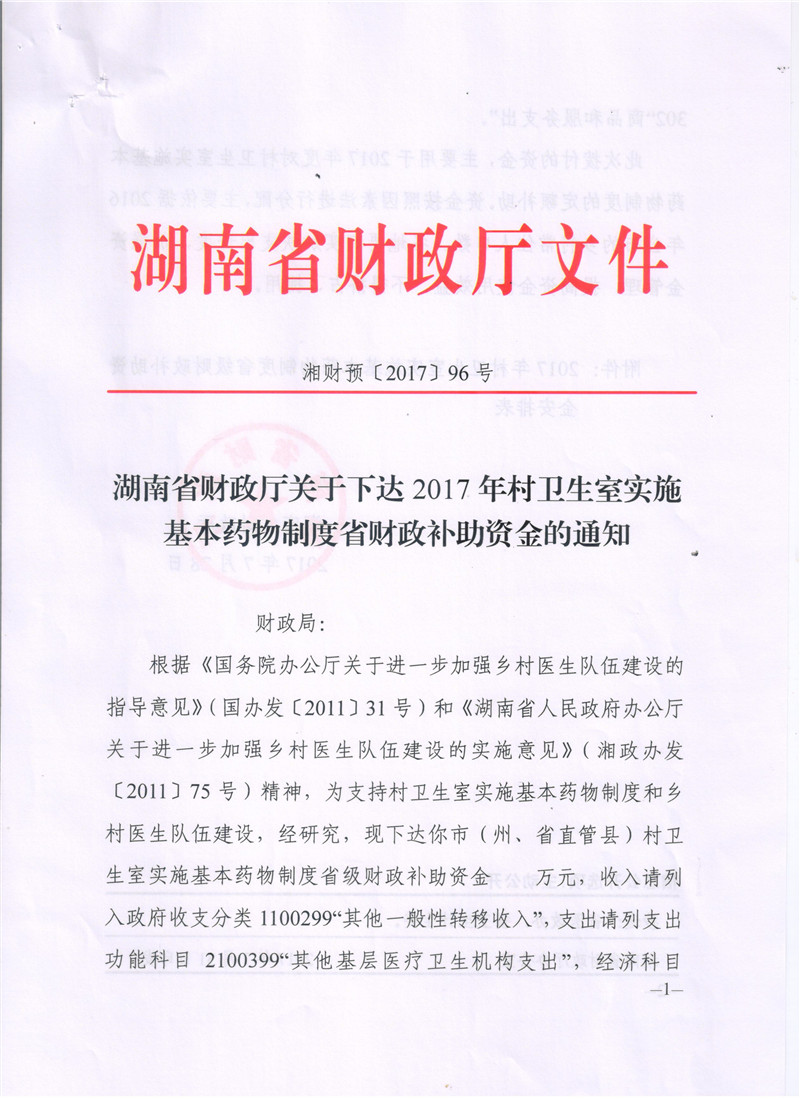 湖南省财政厅关于下达2017年村卫生实施基本药物制度省财政补助资金的通知