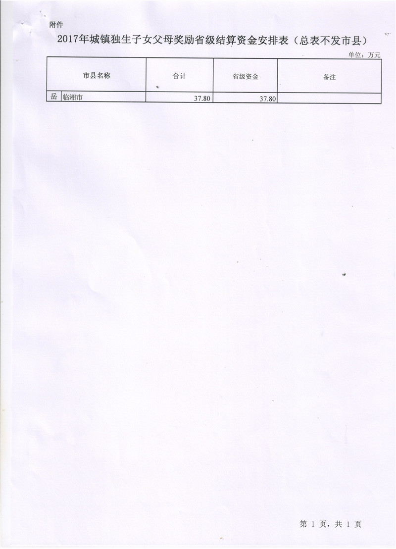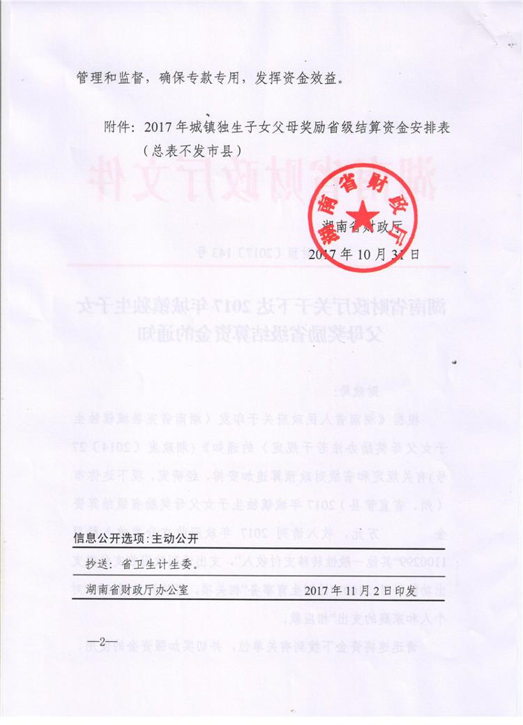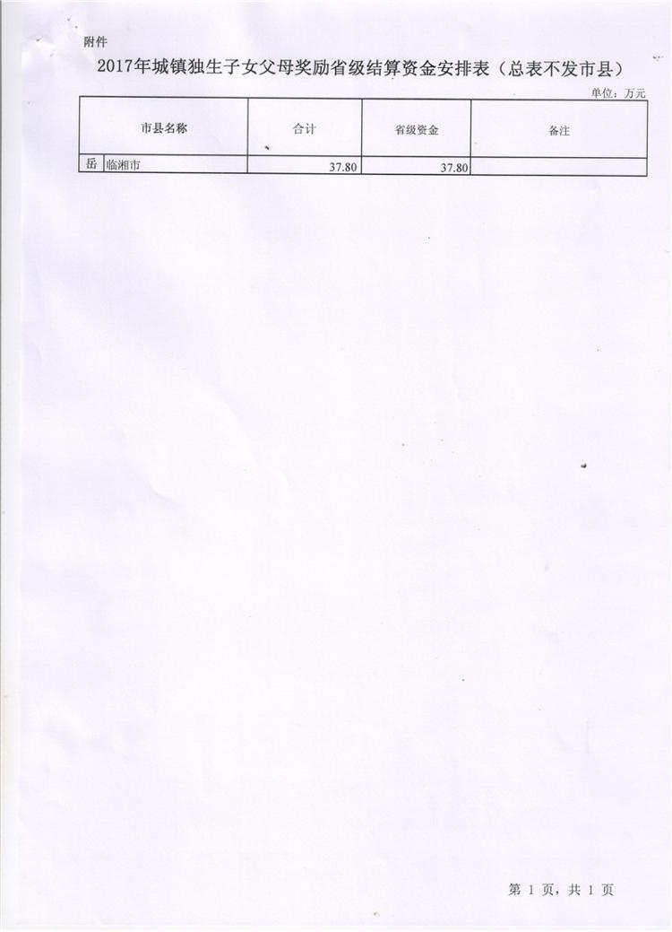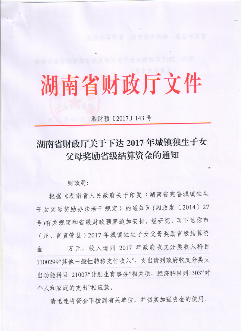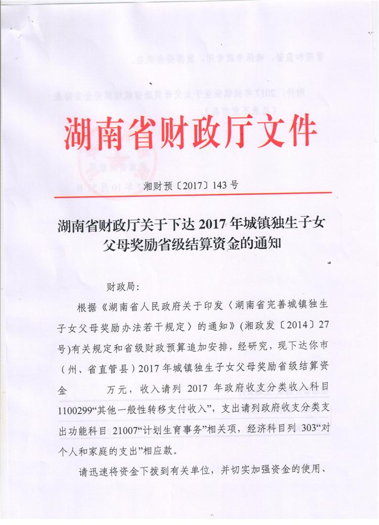 湖南省财政厅关于下达2017年城镇独生子女父母奖励省级结算资金的通知