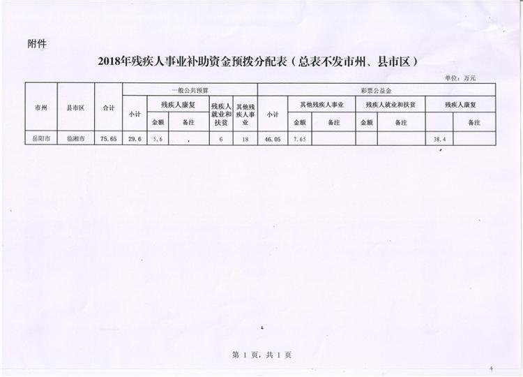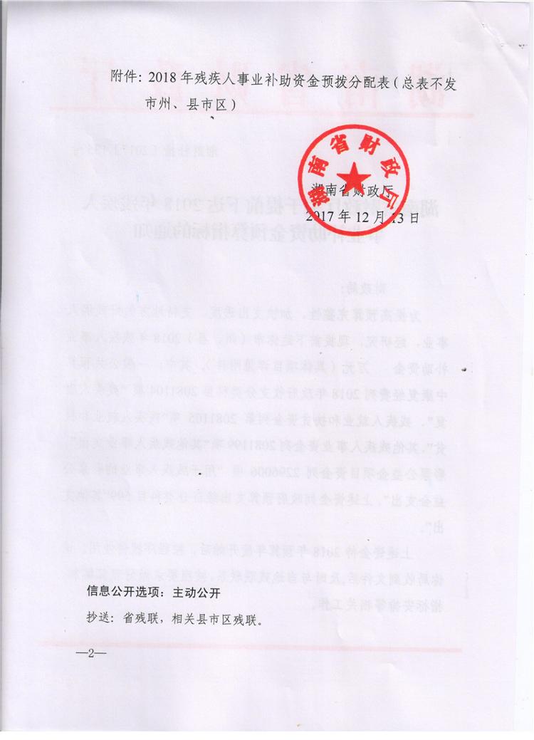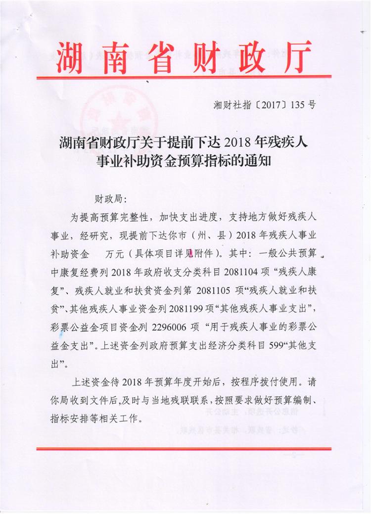 湖南省财政厅关于提前下达2018年残疾人事业补助资金预算指标的通知