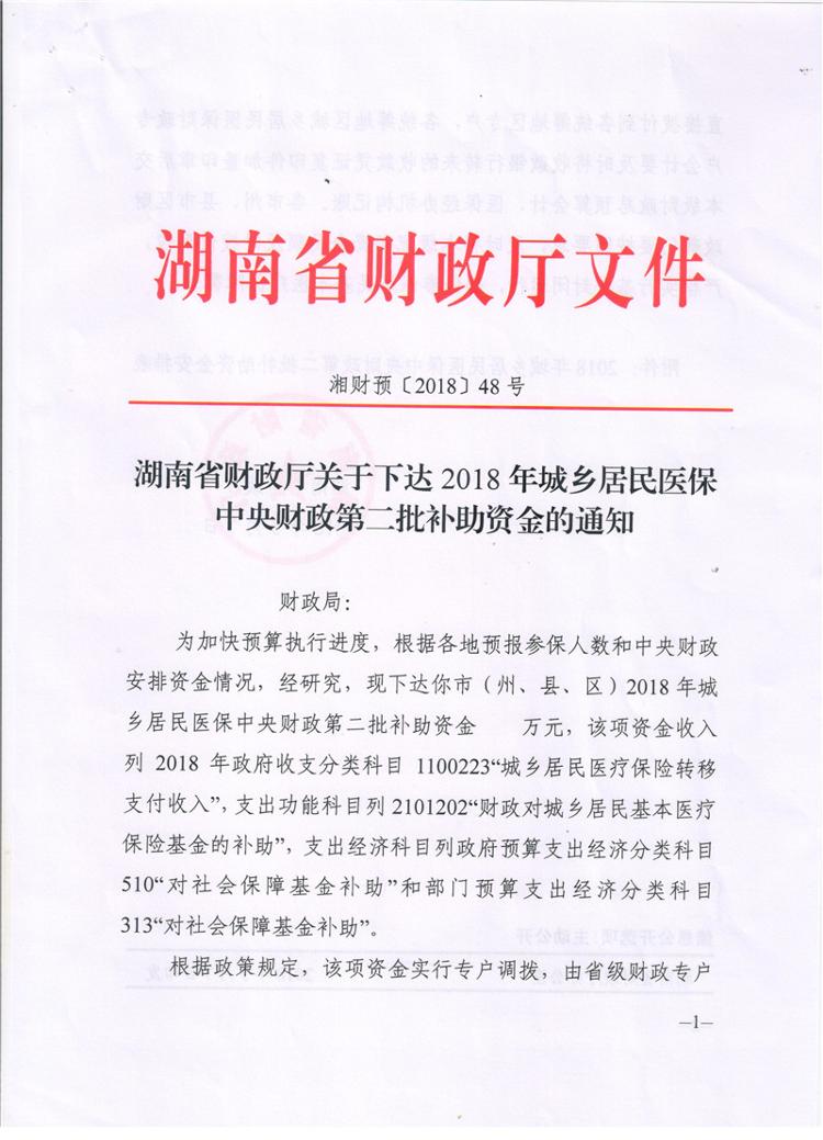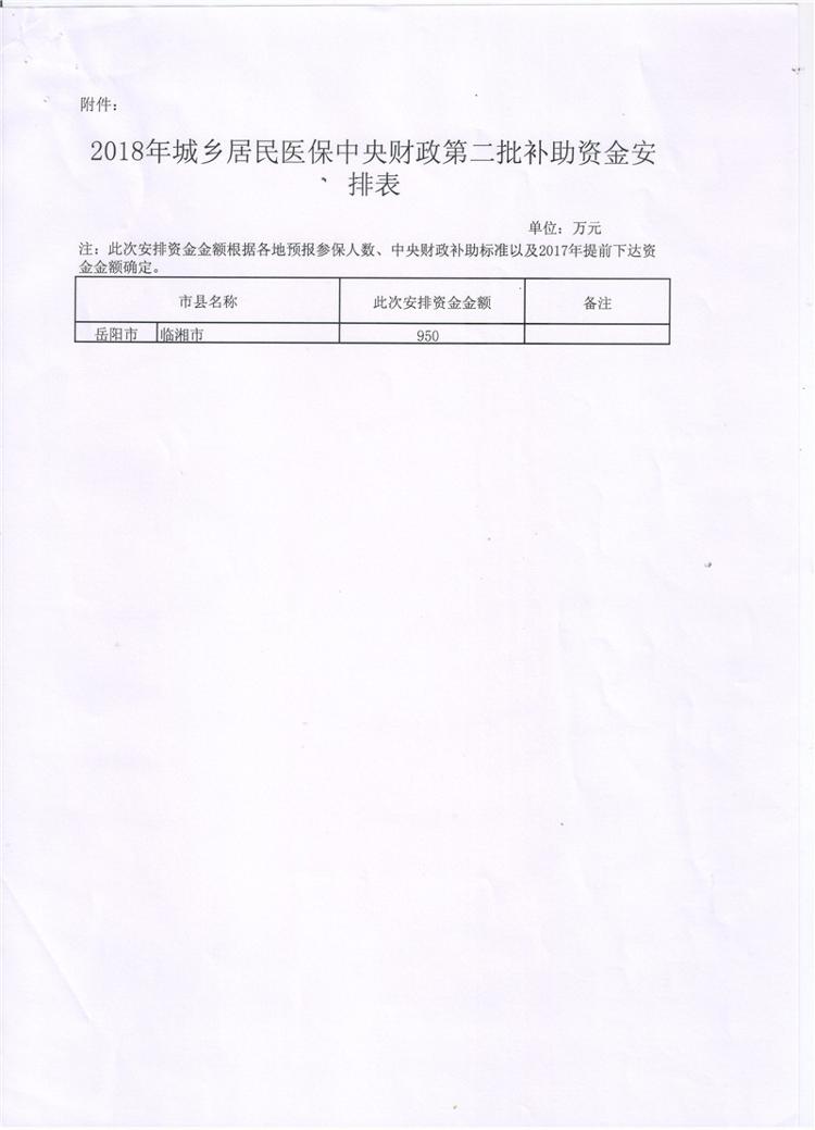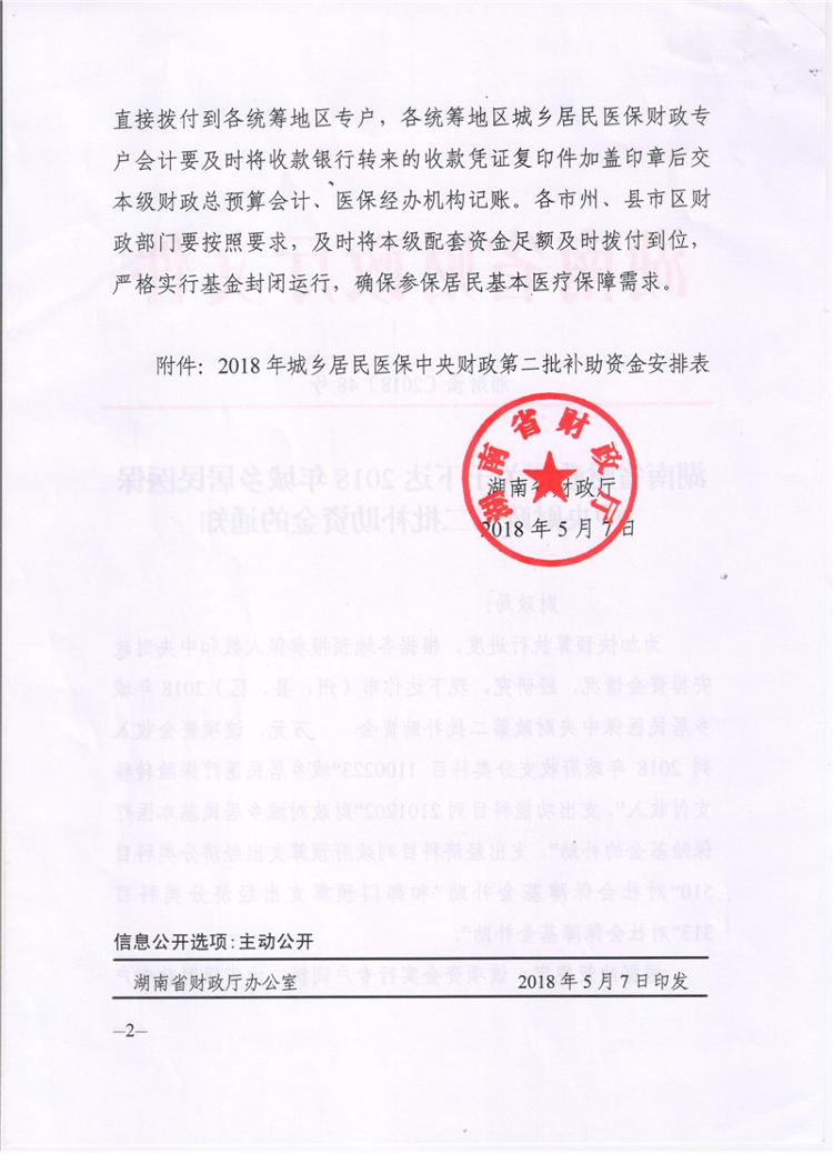 湖南省财政厅关于下达2018年城乡居民医保中央财政第二批补助资金的通知