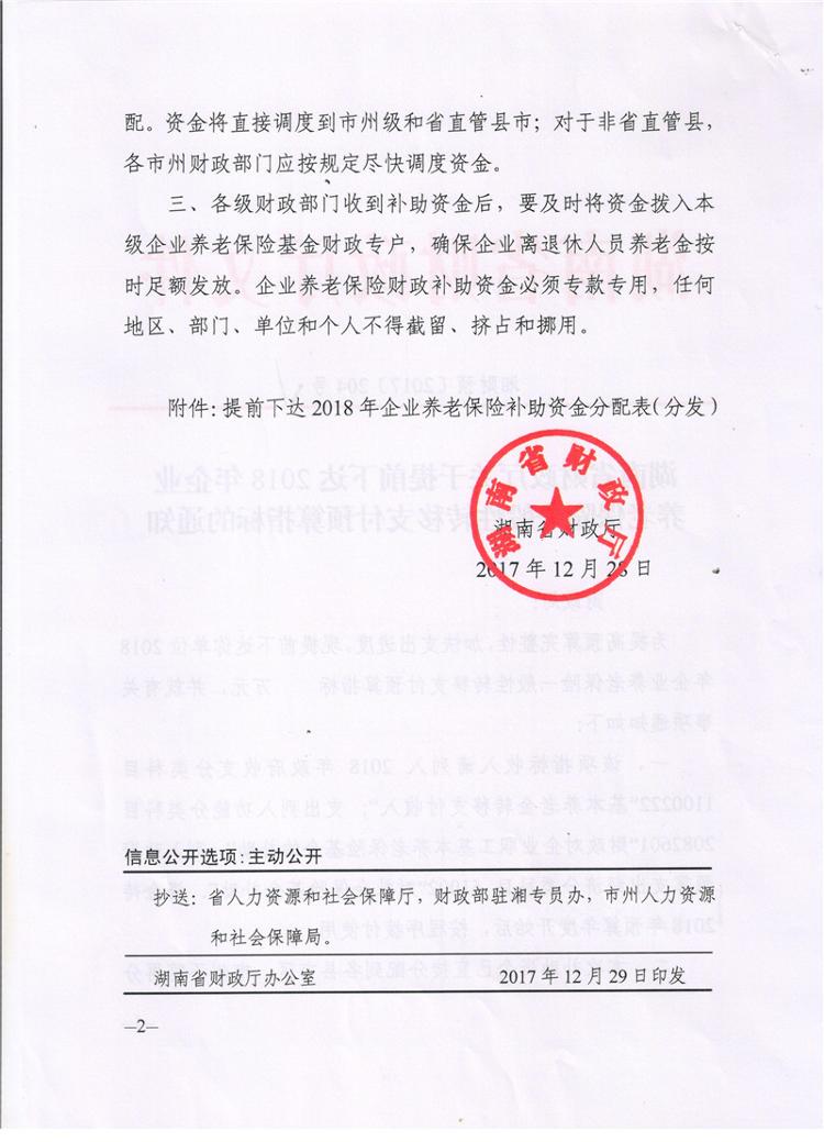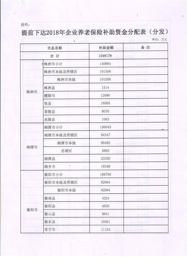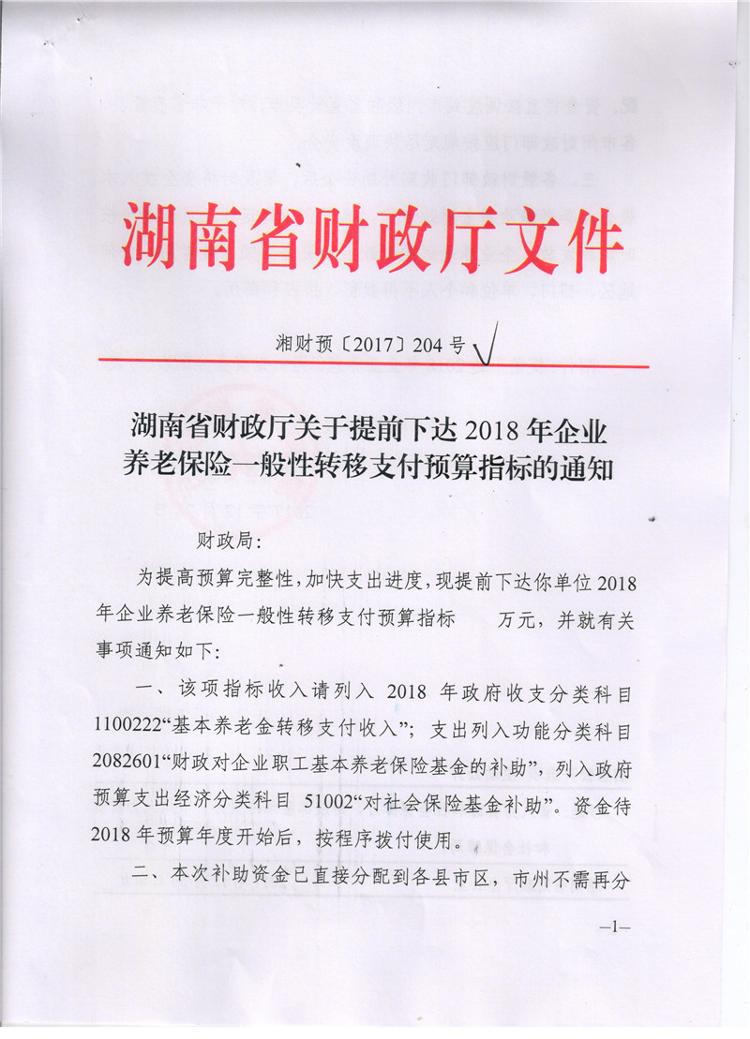 湖南省财政厅关于提前下达2018年企业养老保险一般性转移支付预算指标的通知