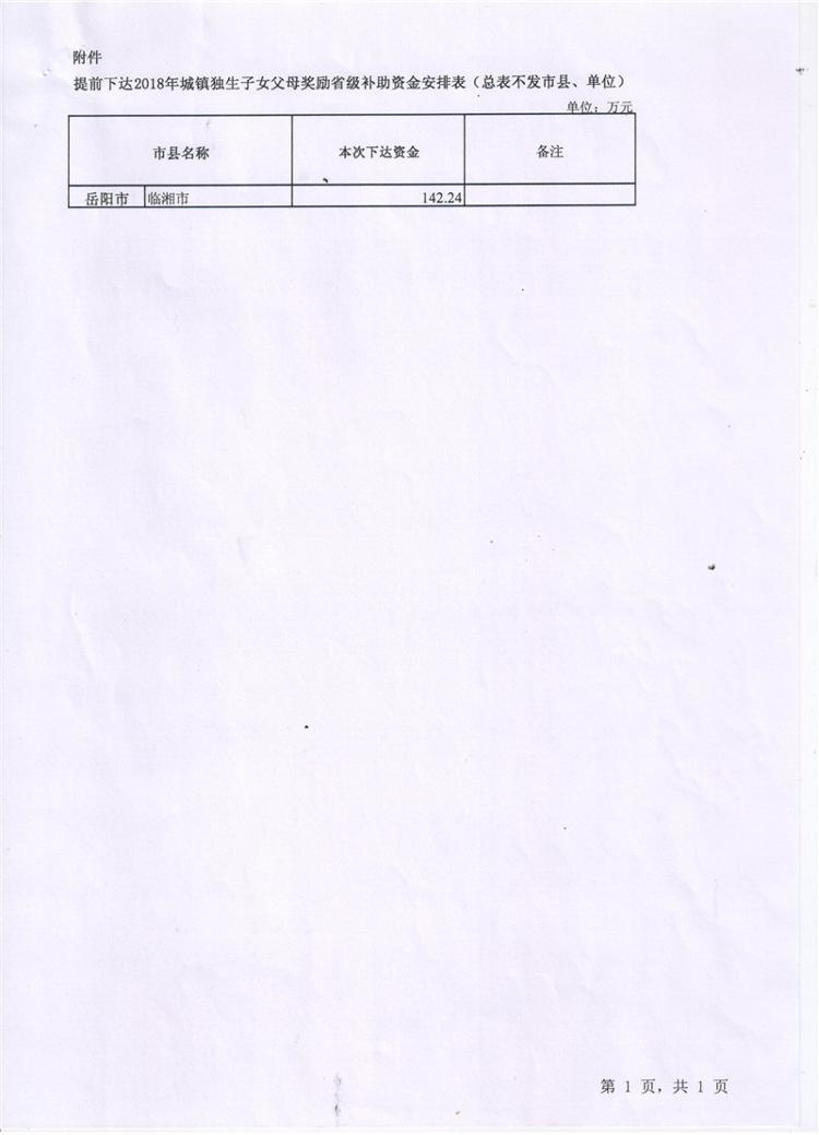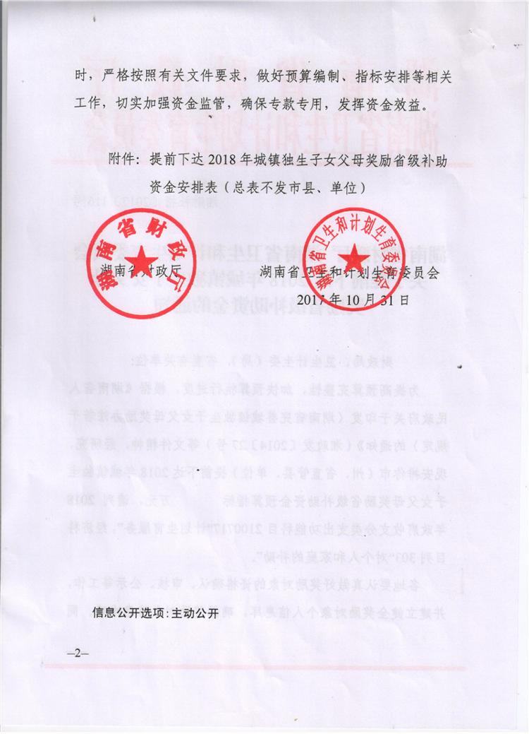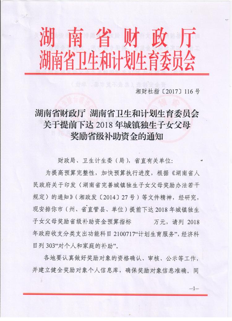 湖南省财政厅湖南省卫生和计划生育委员会关于提前下达2018年城镇独生子女父母资励省级补助资金的通知