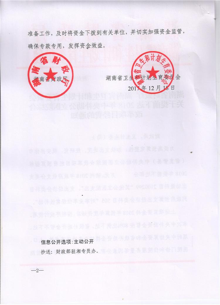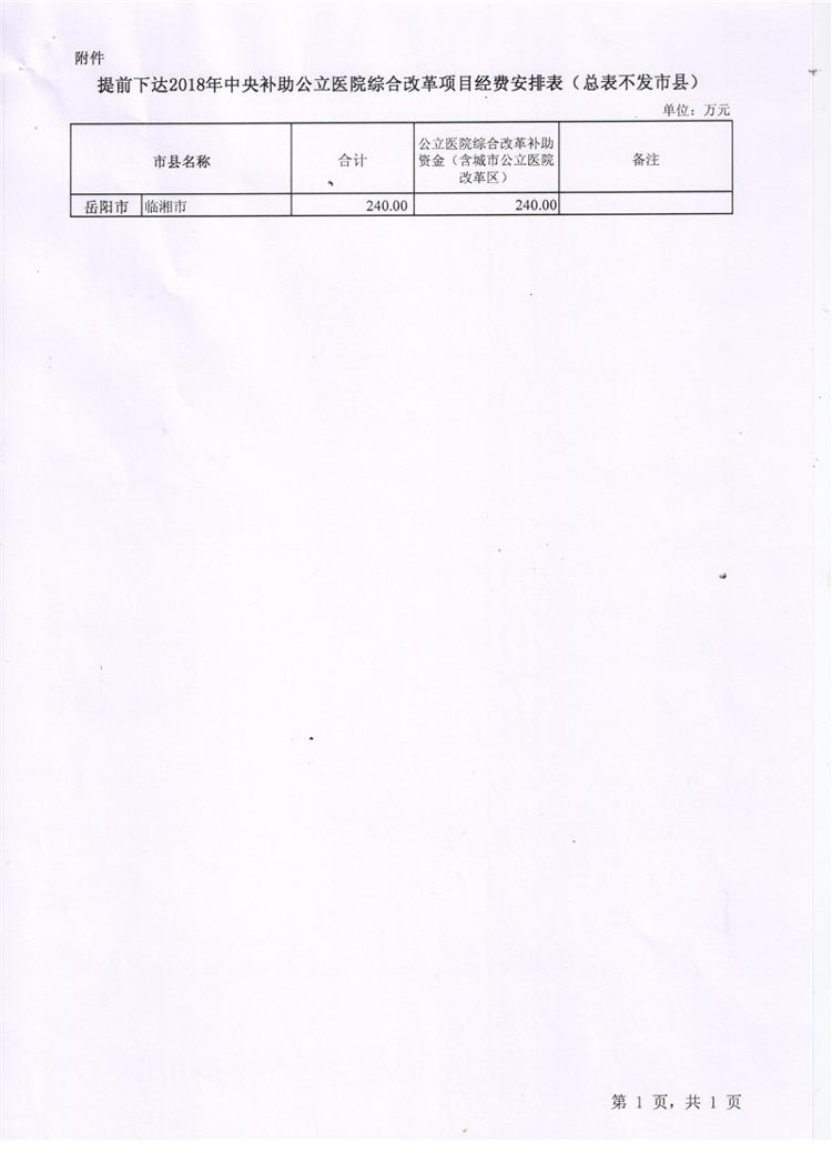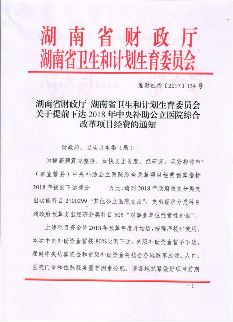 湖南省财政厅湖南省卫生和计划生育委员会关于提前下达2018年中央补助公立医院综合改革项目经费的通知