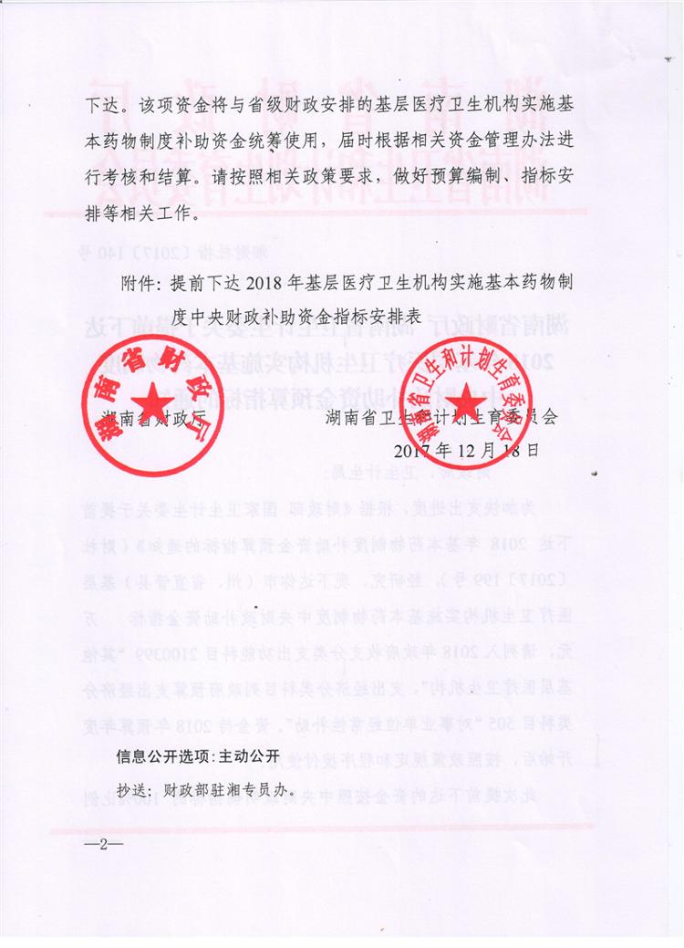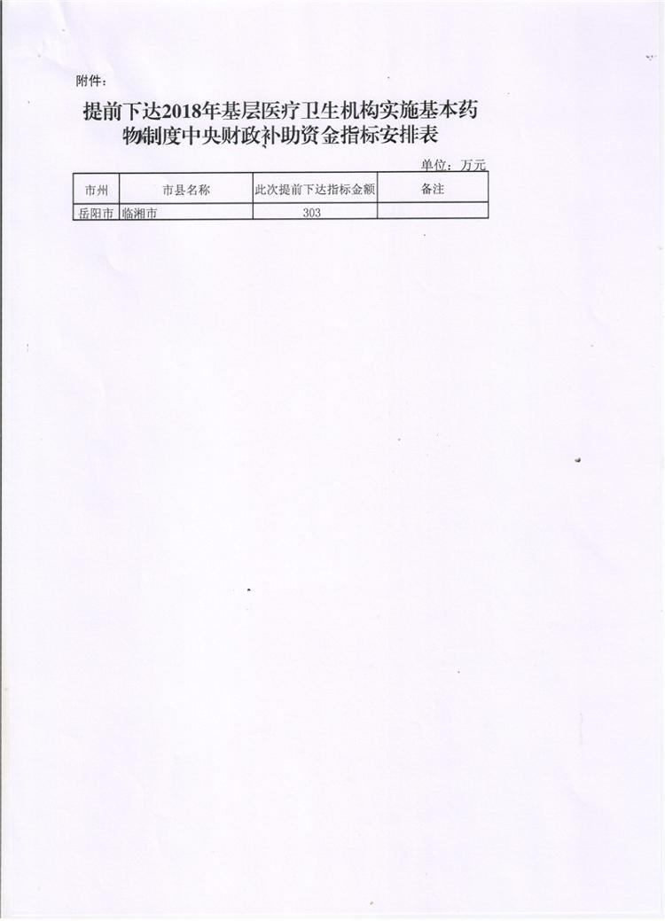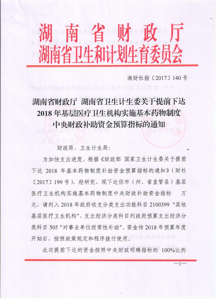 湖南省财政厅湖南省卫生和计划生育委员会关于提前下达2018年基层医疗卫生机构实施基本药物制度中央财政补助资金预算指标的通知