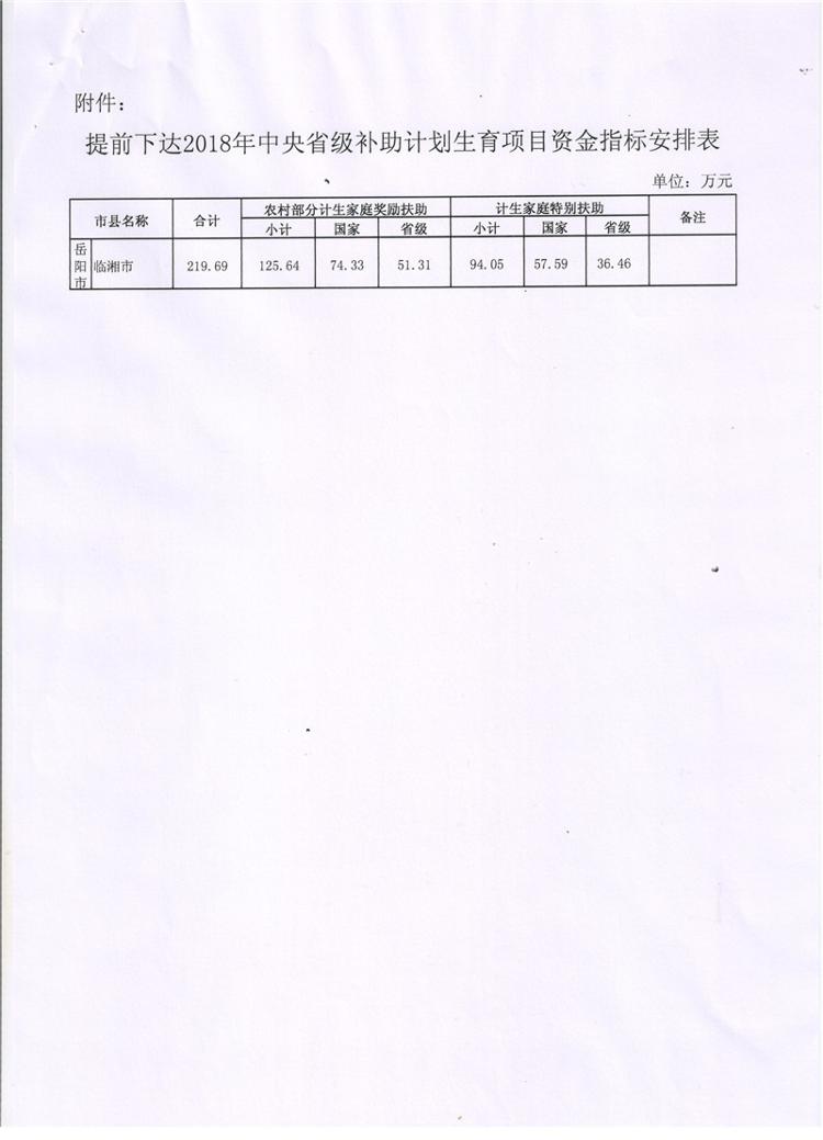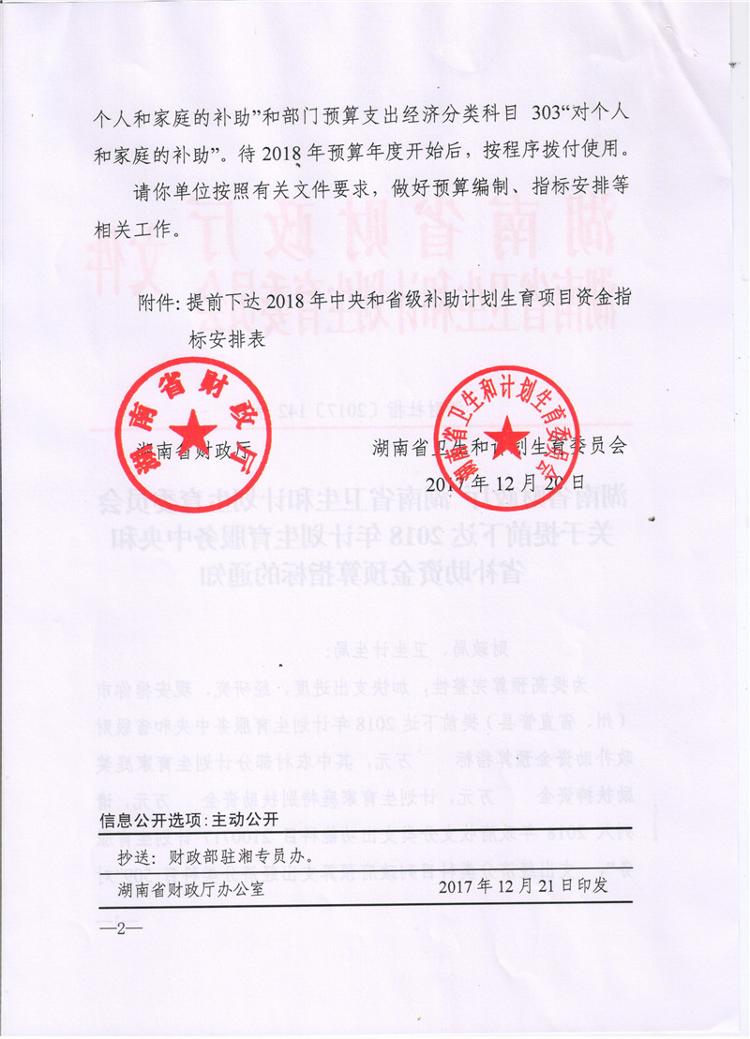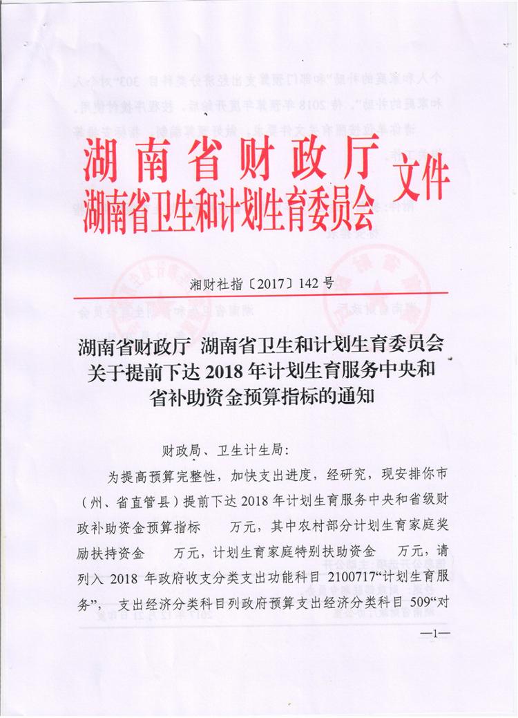 湖南省财政厅湖南省卫生和计划生育委员会关于提前下达2018年计划生育服务中央和省级补助资金预算指标的通知