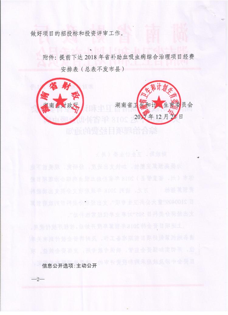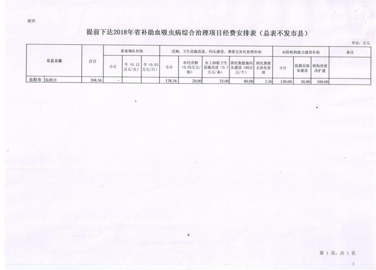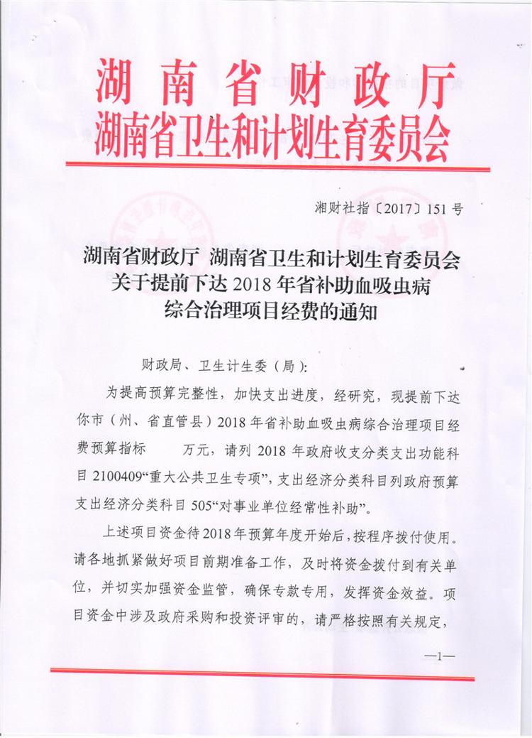 湖南省财政厅湖南省卫生和计划生育委员会关于提前下达2018年省补助血吸虫病综合治理项目经费的通知