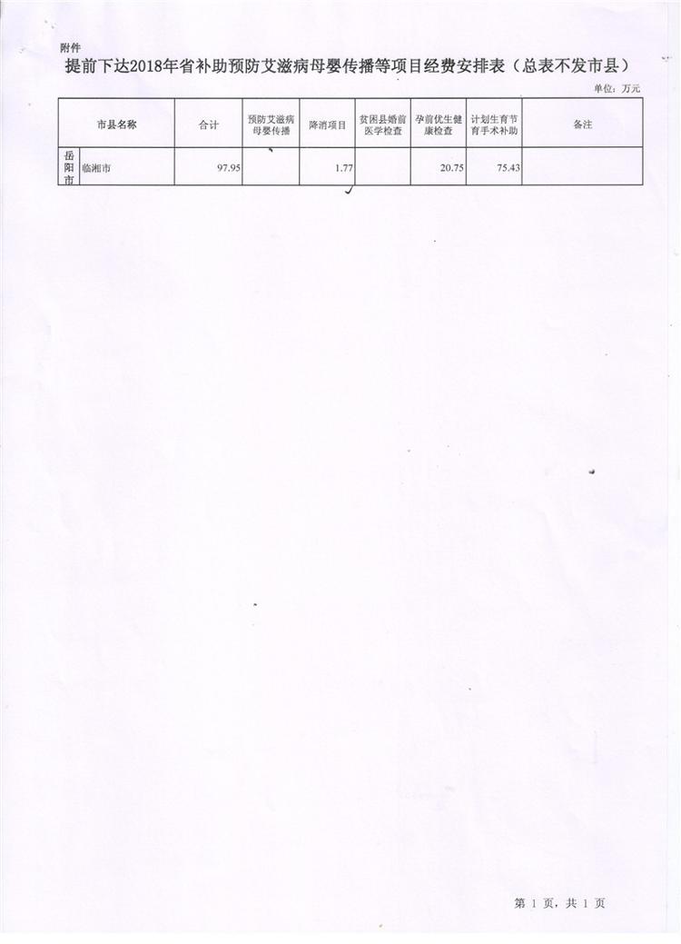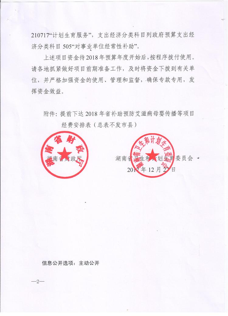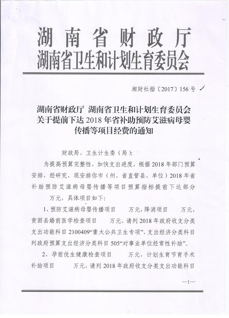 湖南省财政厅湖南省卫生和计划生育委员会关于提前下达2018年省补助预防艾滋病母婴传播等项目经费的通知