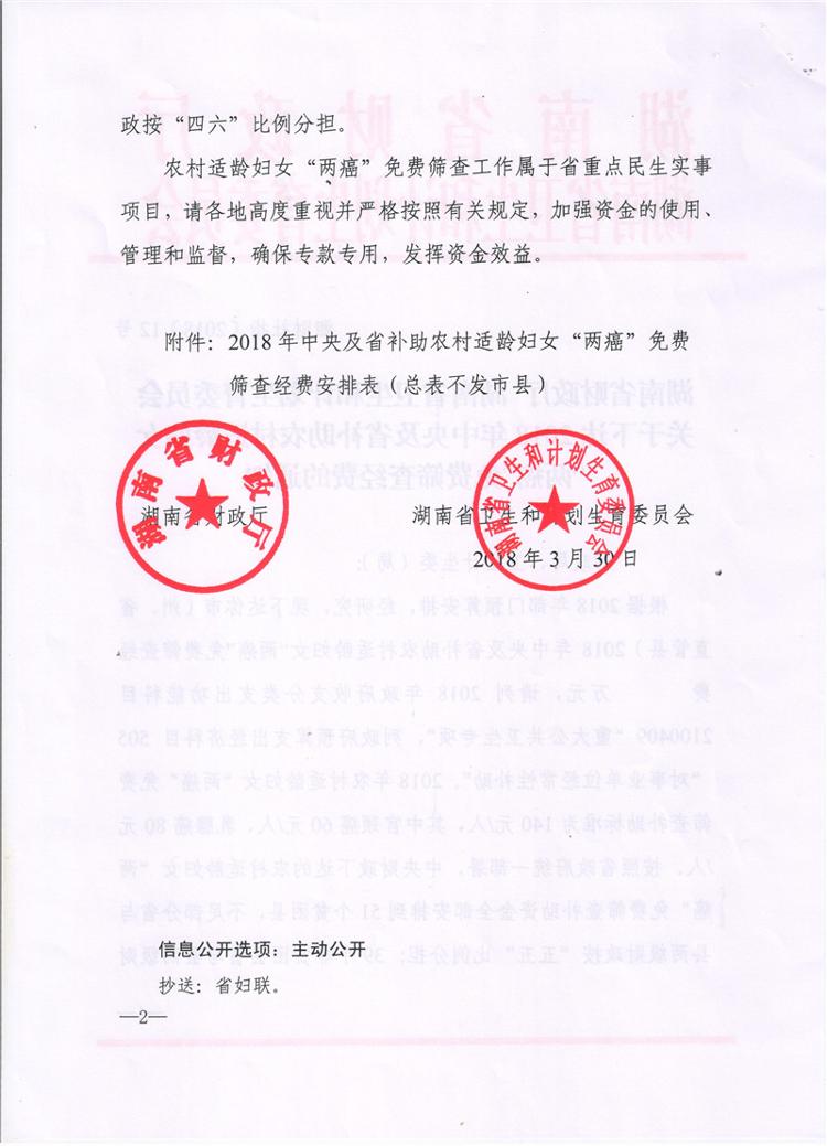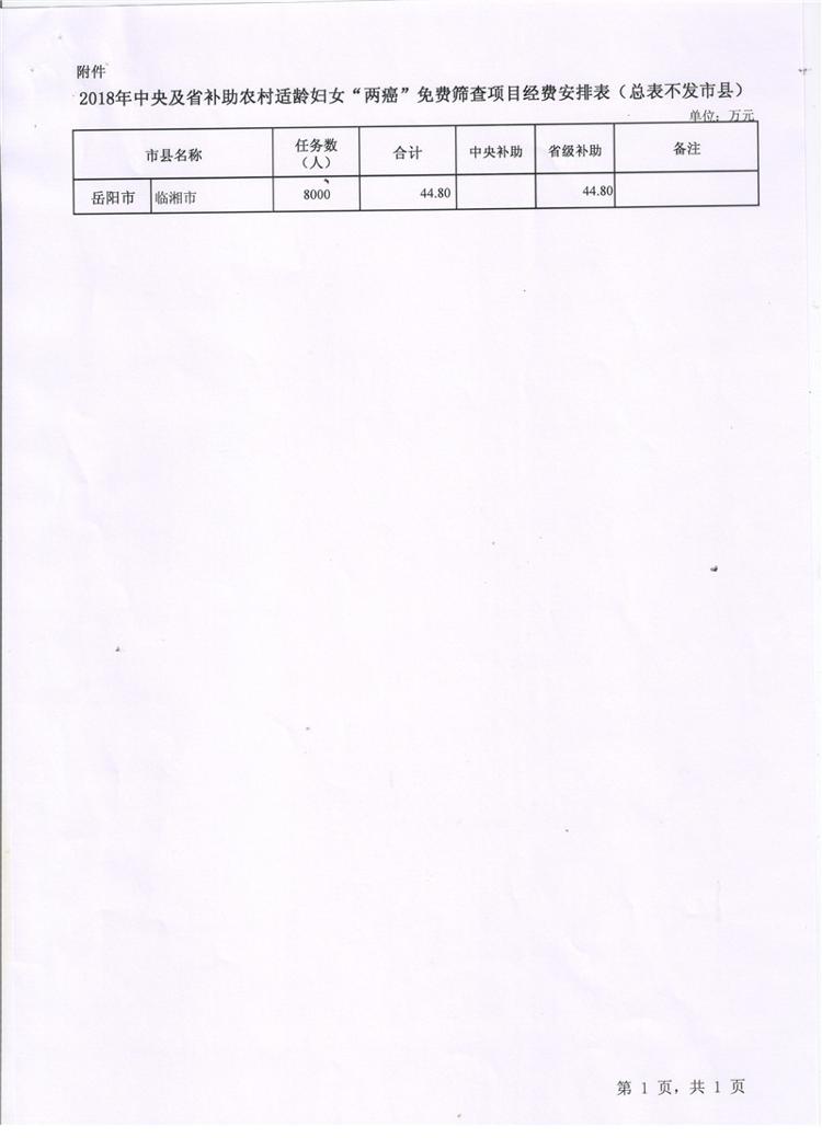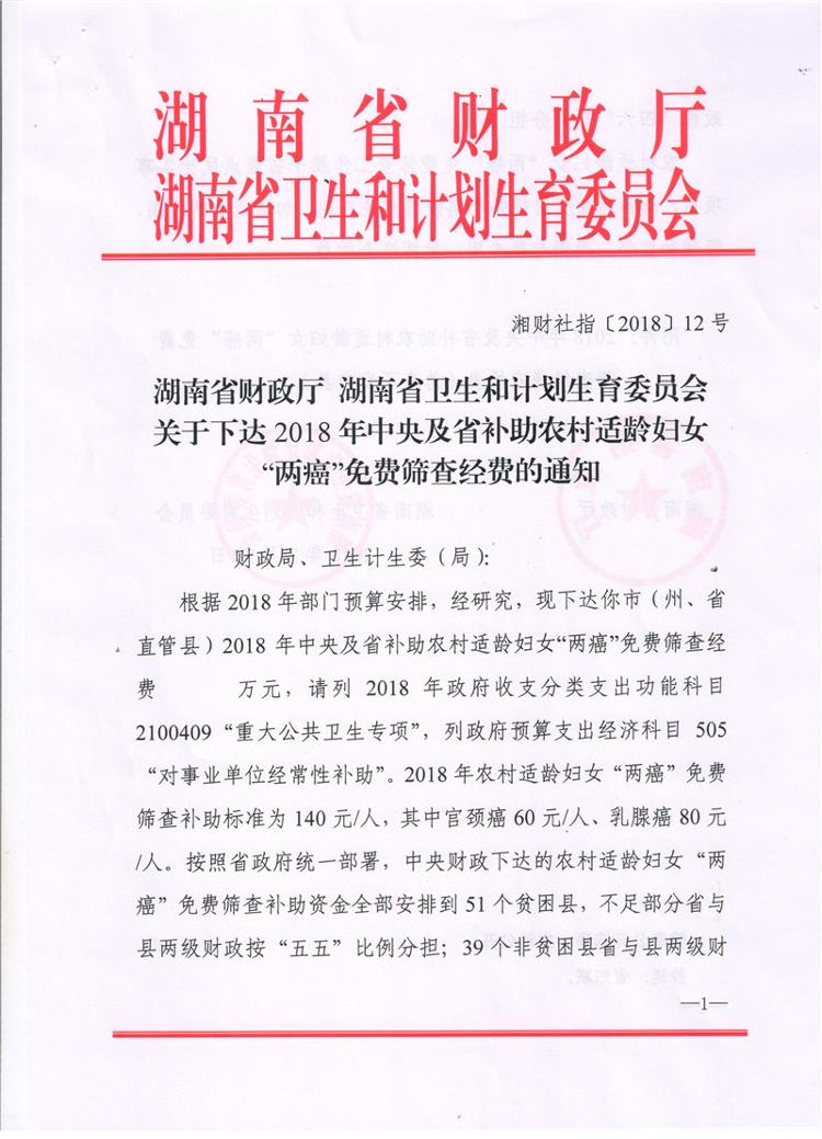 湖南省财政厅湖南省卫生和计划生育委员会关于下达2018年中央及省补助农村适齡妇女“两癌”免费筛查经费的通知