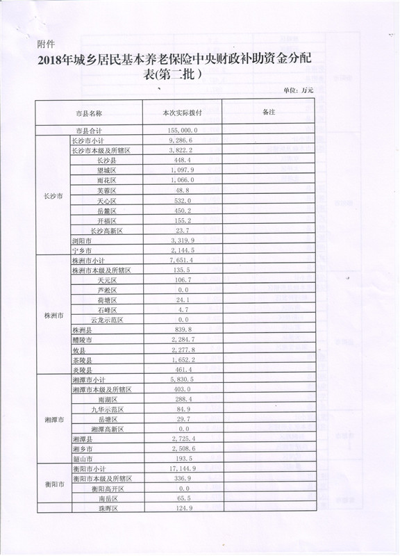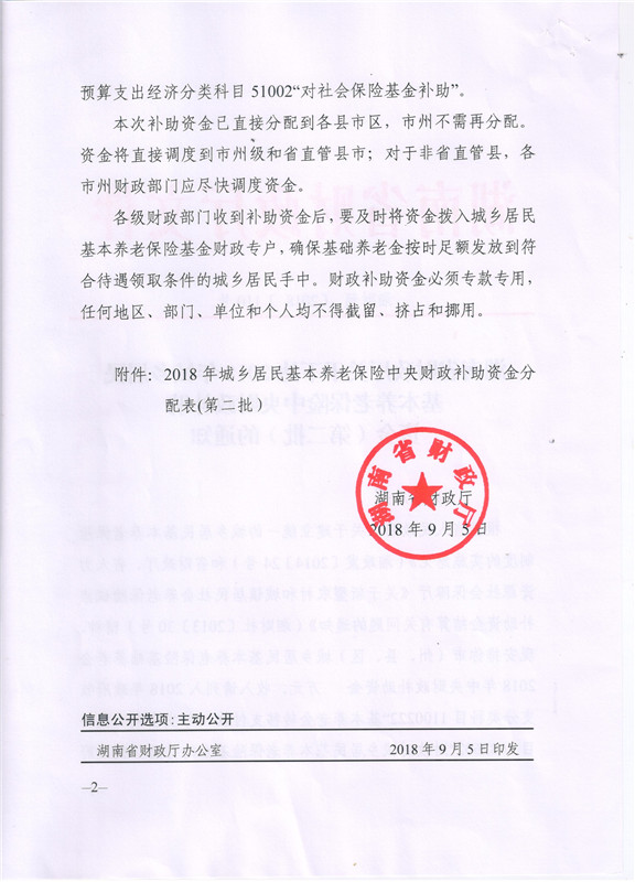 湖南省财政厅关于下达2018年城乡居民基本养老保险中央财政补助资金(第二批)的通知