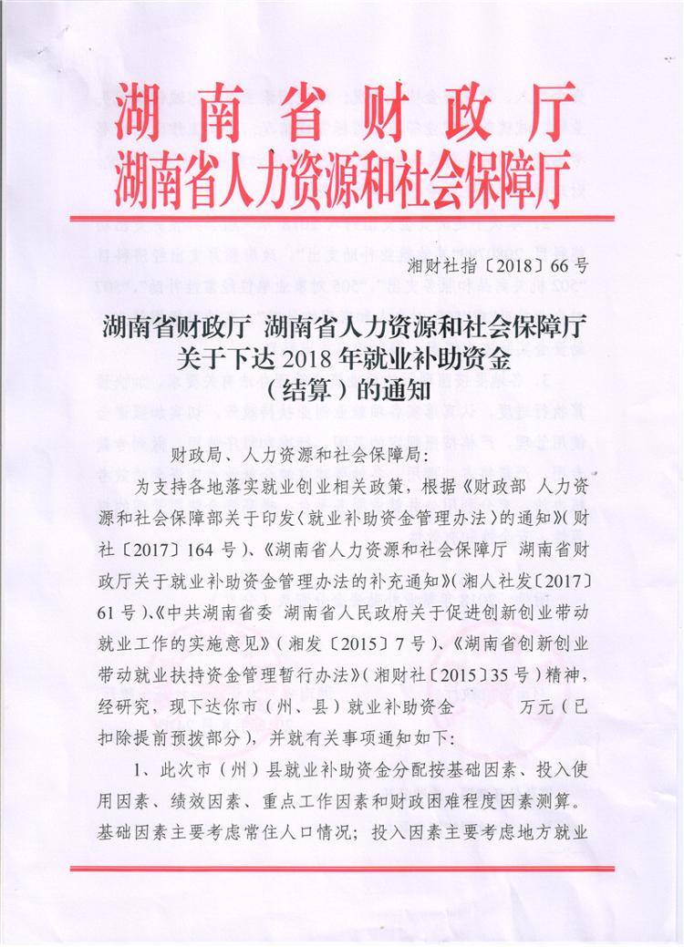 湖南省财政厅湖南省人力资源和社会保障厅关于下达2018年就业补助资金(结算)的通知