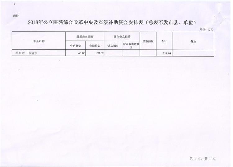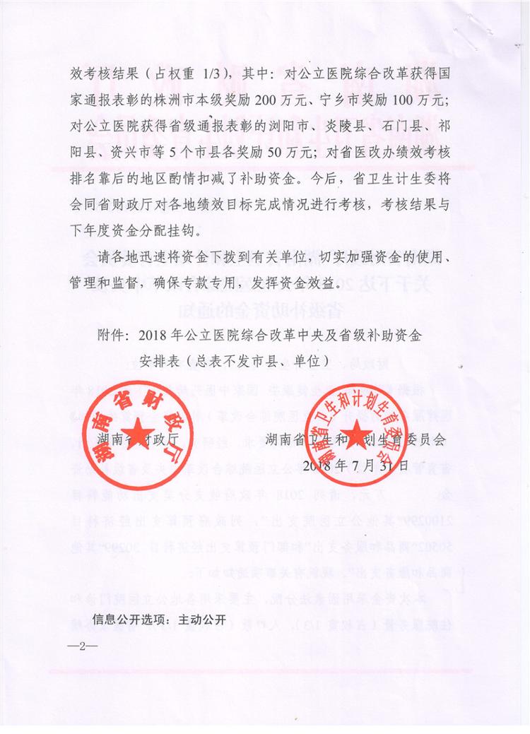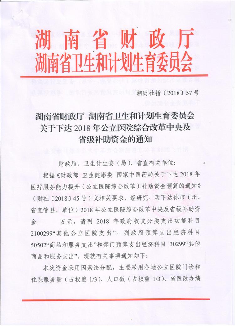 湖南省财政厅湖南省卫生和计划生育委员会关于下达2018年公共医院综合改革中央及省级补助资金的通知