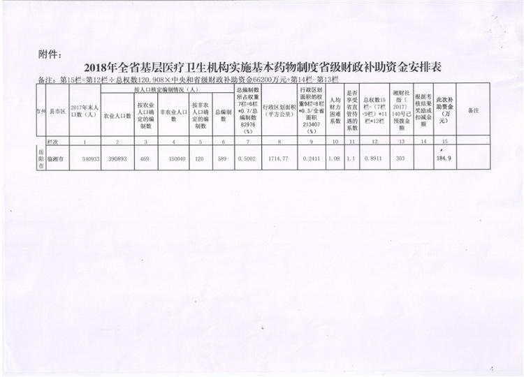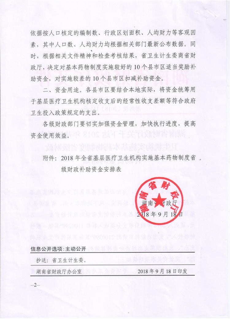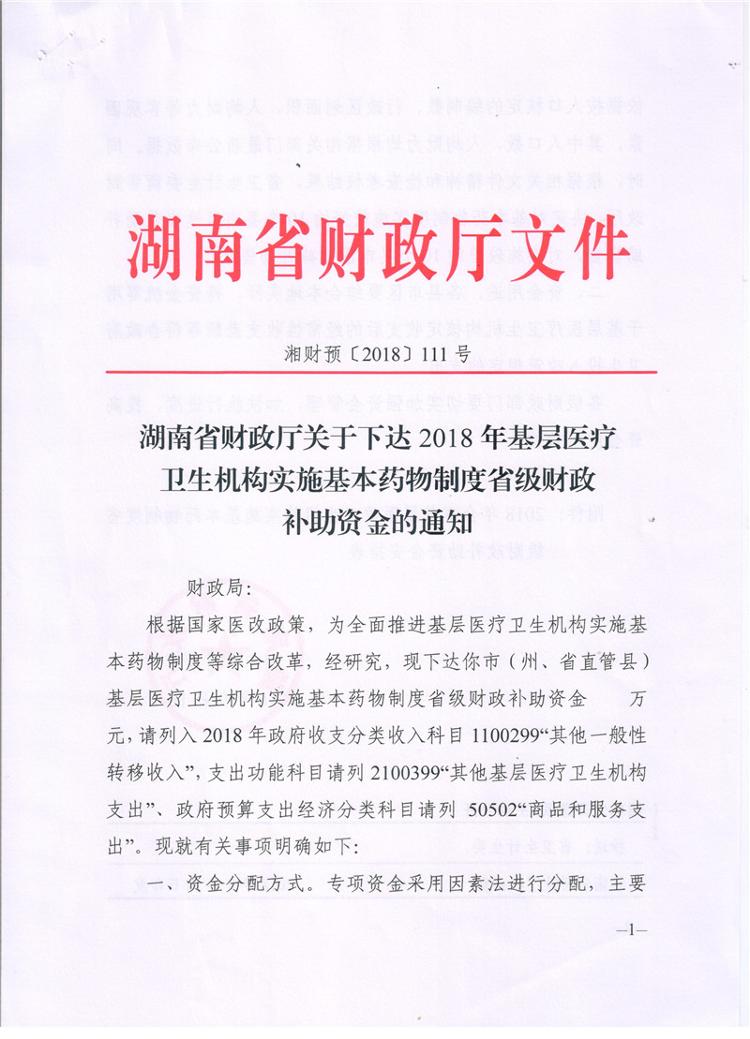湖南省财政厅关于下达2018年基层医疗卫生机构实施基本药物制度省级财政补助资金的通知