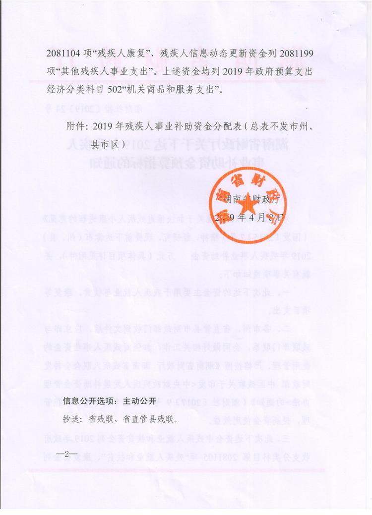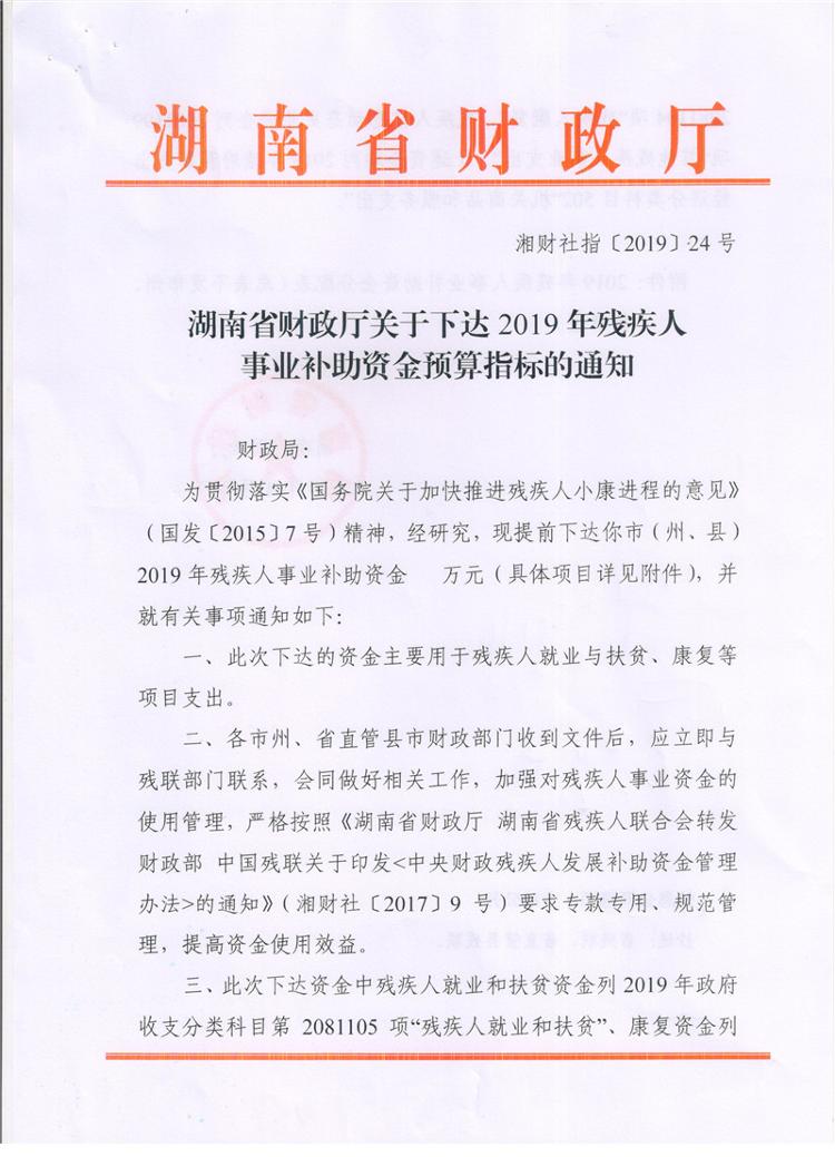 湖南省财政厅关于下达2019年残疾人事业补助资金预算指标的通知