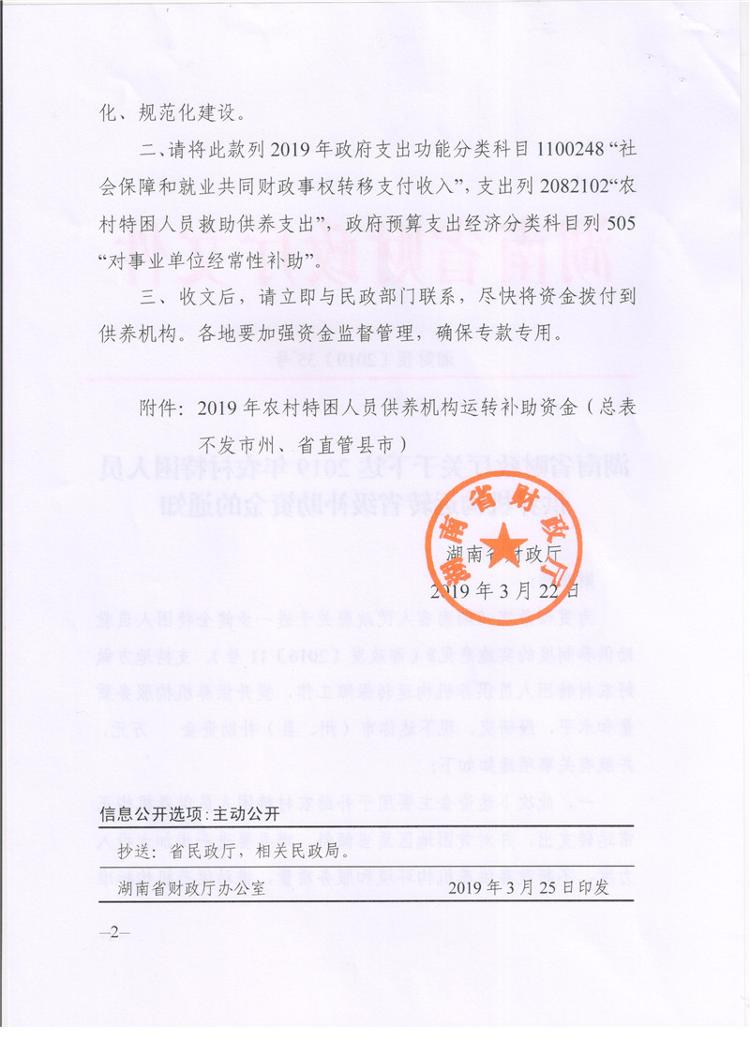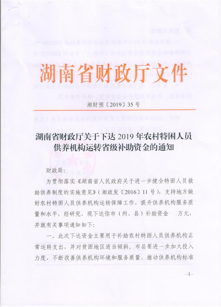 湖南省财政厅关于下达2019年农村特困人员供养机构运转省级补助资金的通知