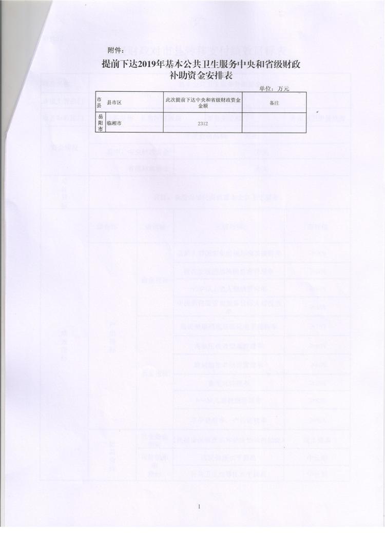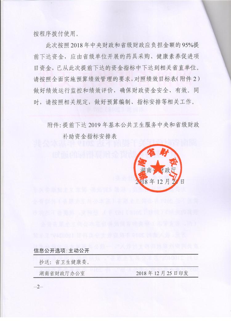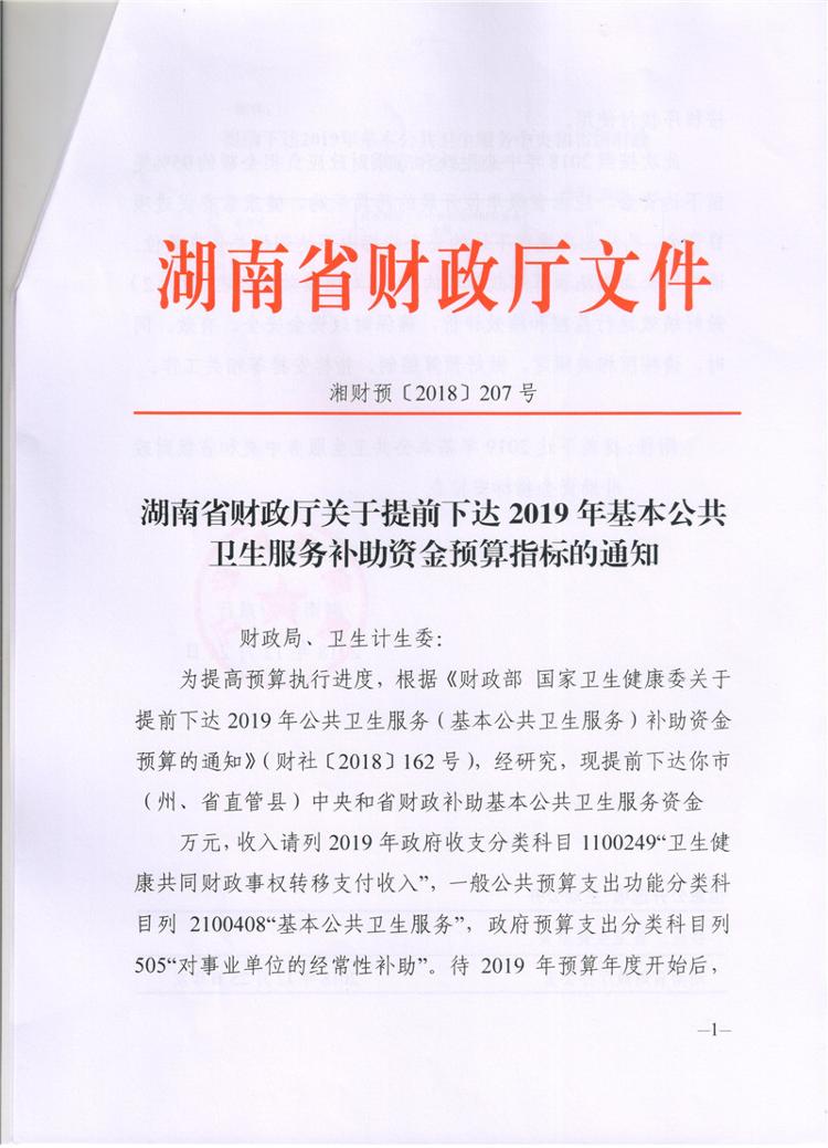 湖南省财政厅关于提前下达2019年基本公共卫生服务补助资金预算指标的通知