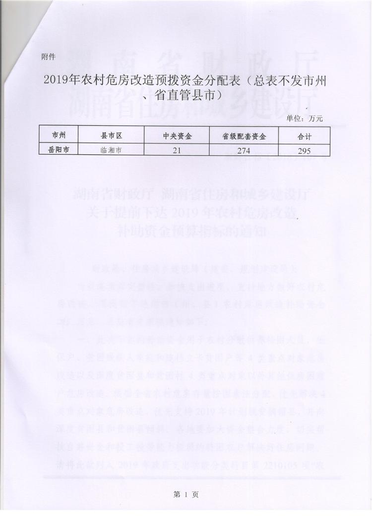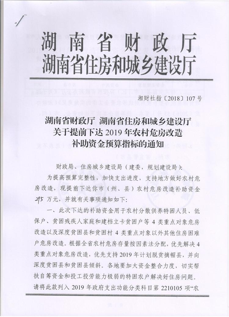 湖南省财政厅湖南省住房和城乡建设厅关于提前下达2019年农村危房改造补助资金预算指标的通知