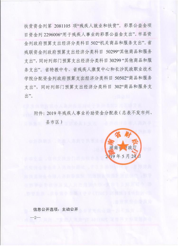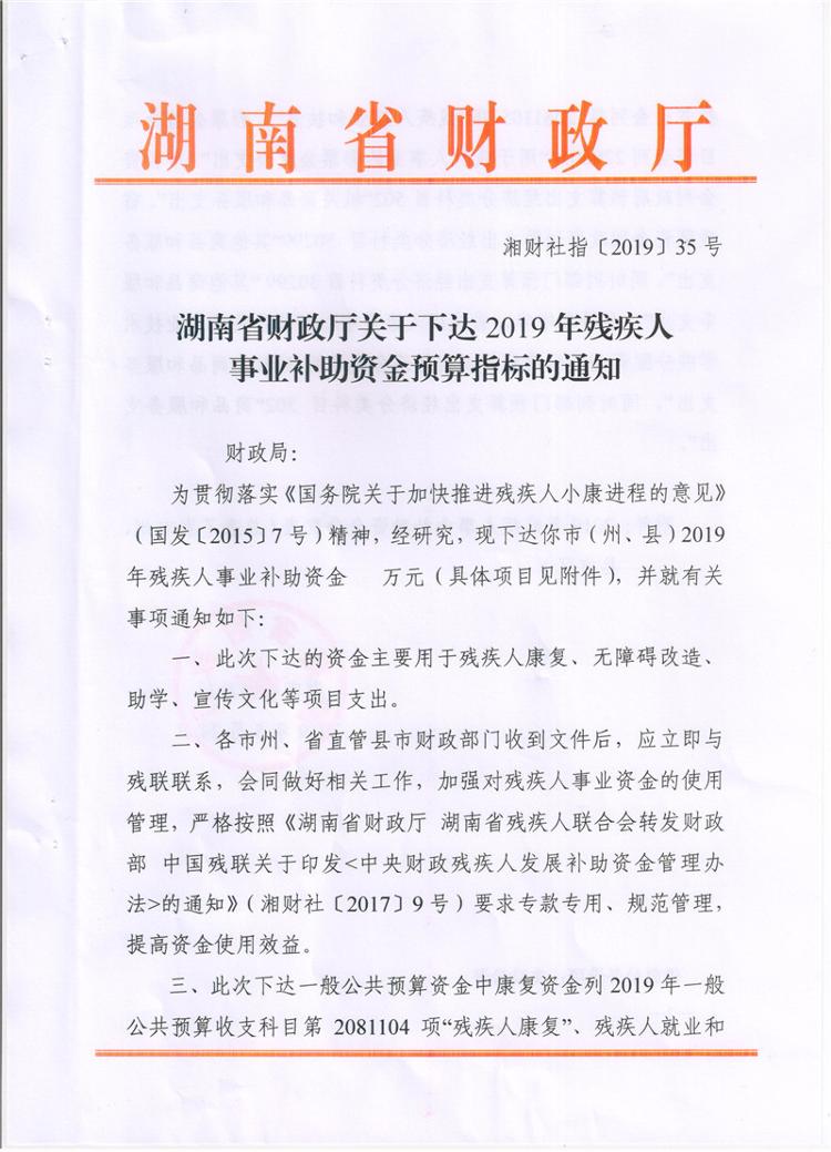 湖南省财政厅关于下达2019年残疾人事业补助资金预算指标的通知