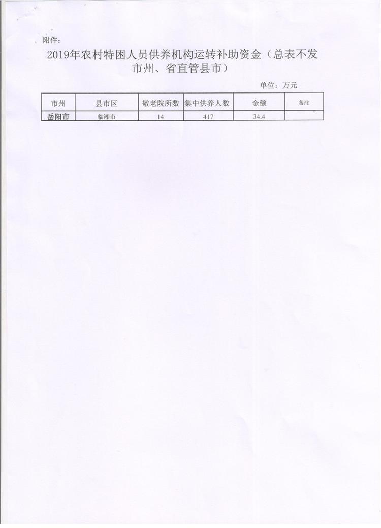 湖南省财政厅关于下达2019年农村特困人员供养机构运转省级补助资金的通知(湘财预【2019】35号)