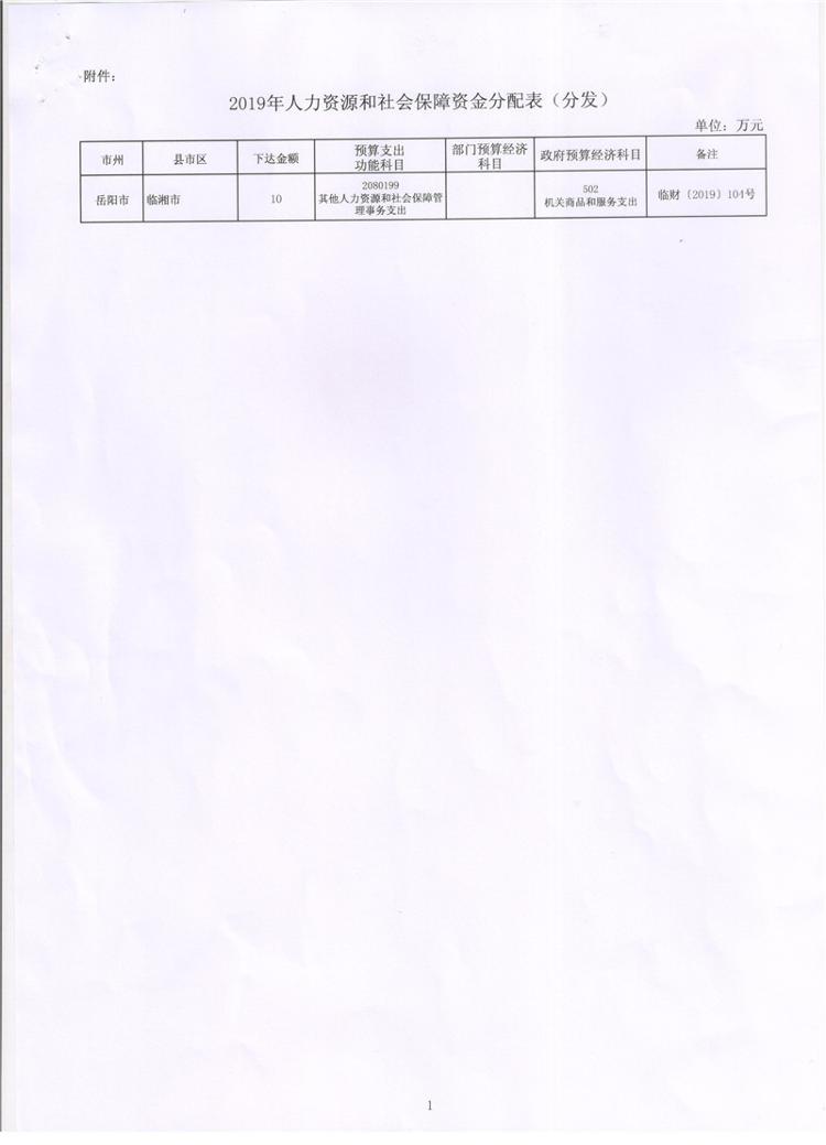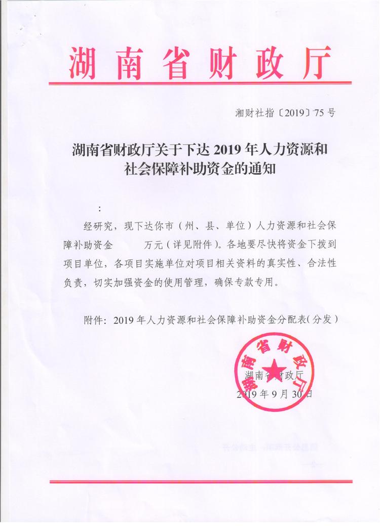 湖南省财政厅关于下达2019年人力资源和社会保障补助资金的通知